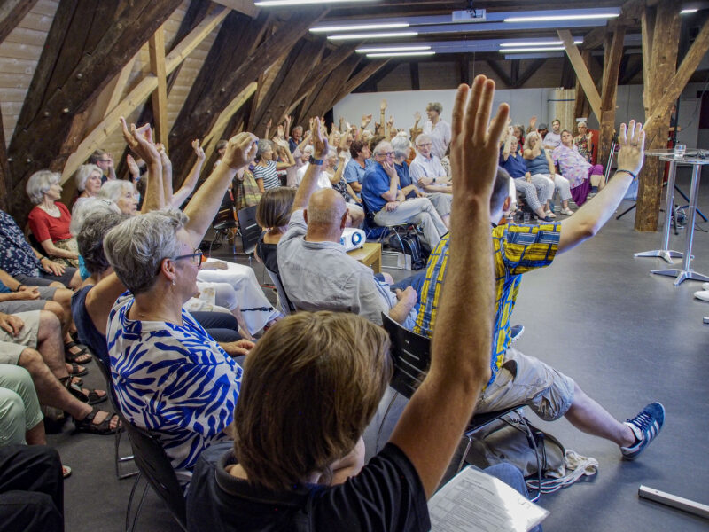 Den Abschluss machte Tabea Arnold (29), Vorstandsmitglied und HelferInnenkoordinatorin beim Generationenfestival 2023, mit einem Aufruf: «Ein grosses Dankeschön an die 50 Menschen, die sich als HelferInnen am Generationenfestival 2023 zur Verfügung – jetzt brauchen wir noch weitere 100 Menschen.» Der Saal lacht, etwas erschrocken, doch die leichte Übertreibung nützt: Nach der Hauptversammlung melden sich einige direkt bei Tabea Arnold an. Wer sich engagieren möchte, kann sich unter t.arnold@generationentandem.ch oder direkt hier anmelden.