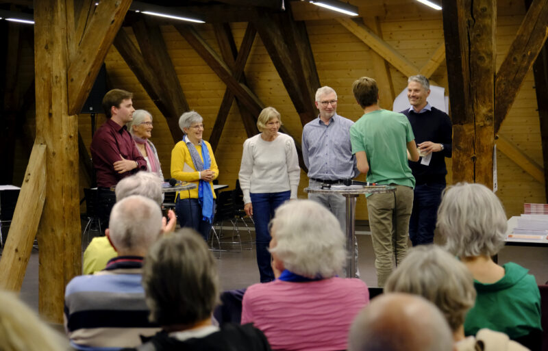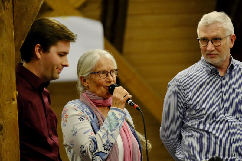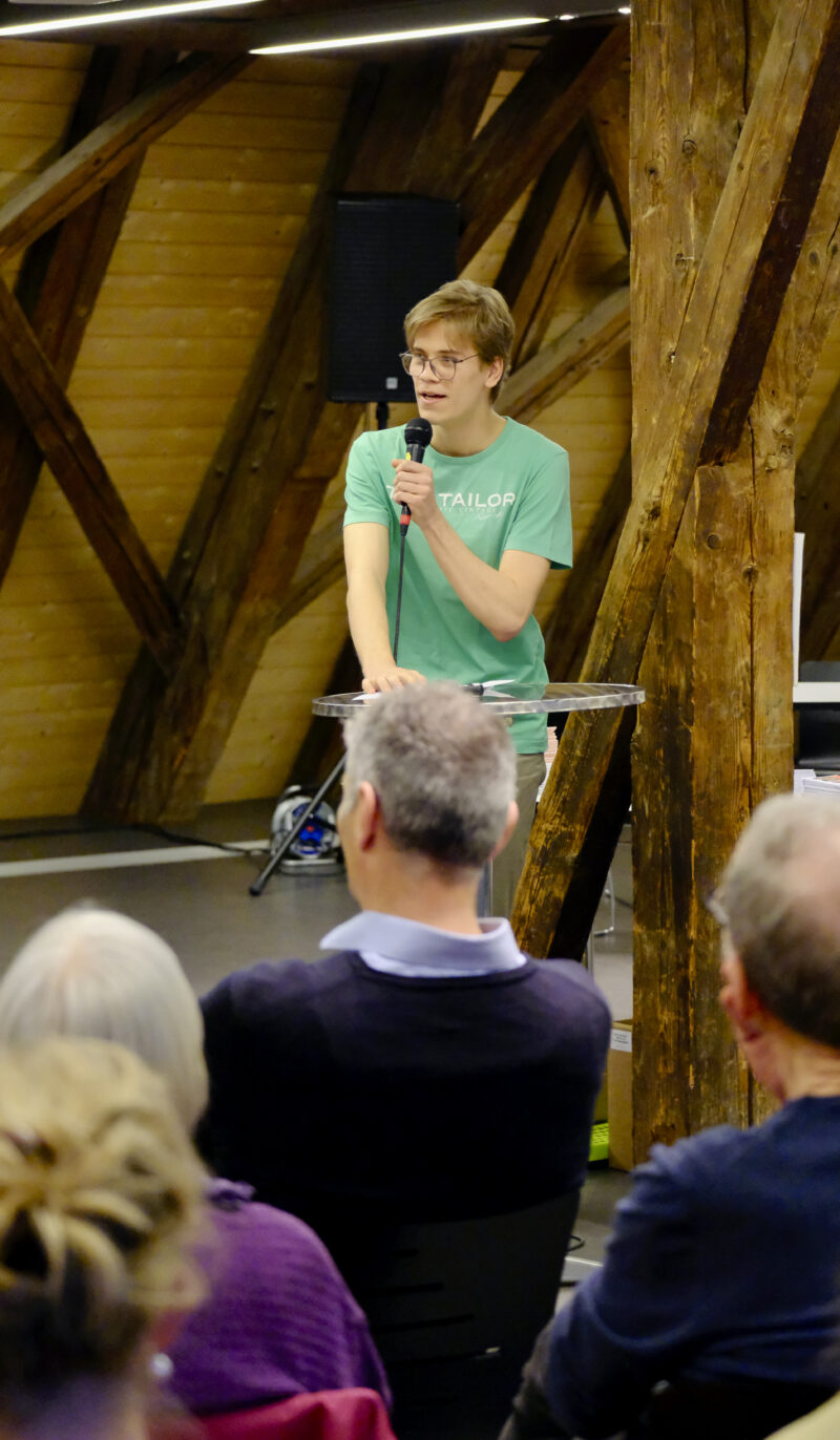 Sie übergibt das Wort das Wort an Luc Marolf (18), der die Gesprächsleitung des Abends übernimmt. Er bittet Co-Präsidentin des Vereins Erika Kestenholz (75), Geschäftsleiter Elias Rüesegger (28) und Ueli Ingold (68), Vorstandsmitglied und Projektleiter des Begegnungszentrums, nach vorne. Sie sprechen über die Vision des offenen Höchhus und die allgemeinen Zukunftspläne von UND Generationentandem.