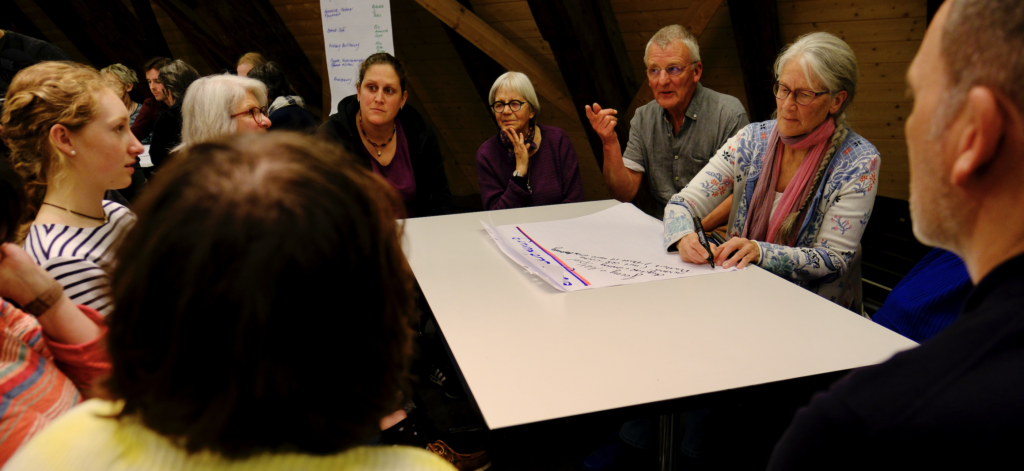 Zum Abschluss des Abends erarbeiten die Anwesenden unter der Anleitung von Fritz Zurflüh (69) Ideen und Inputs, die in die gemeinsame Zukunftsgestaltung des Höchhus einfliessen.
