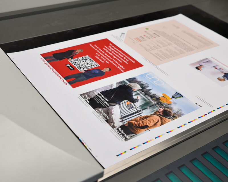 Das Magazin wird im Offsetdruck produziert. Diese Drucktechnik ist weit verbreitet und liefert qualitativ hochwertige Ergebnisse. Dabei wird zuerst eine Druckplatte aus Aluminium vorbereitet. Sie ist entscheidend dafür, in welchem Bereich Farbe aufgetragen wird. Die Stellen, wo Farbe aufgetragen werden soll, werden so präpariert, dass sie Wasser abstossen, die druckfreien Stellen wiederum sollen das Wasser binden. Beim Drucken wird die Druckplatte zunächst befeuchtet.