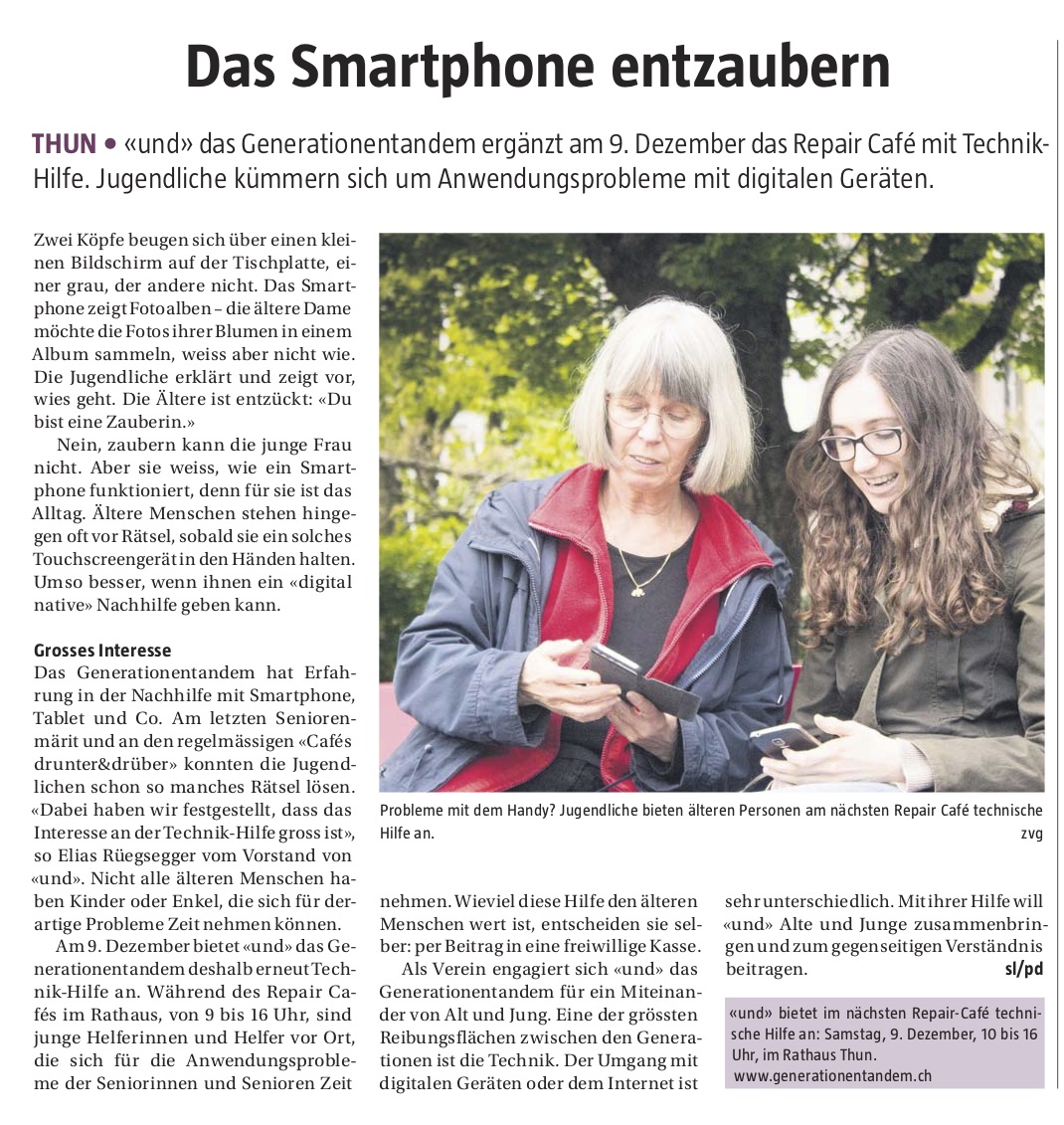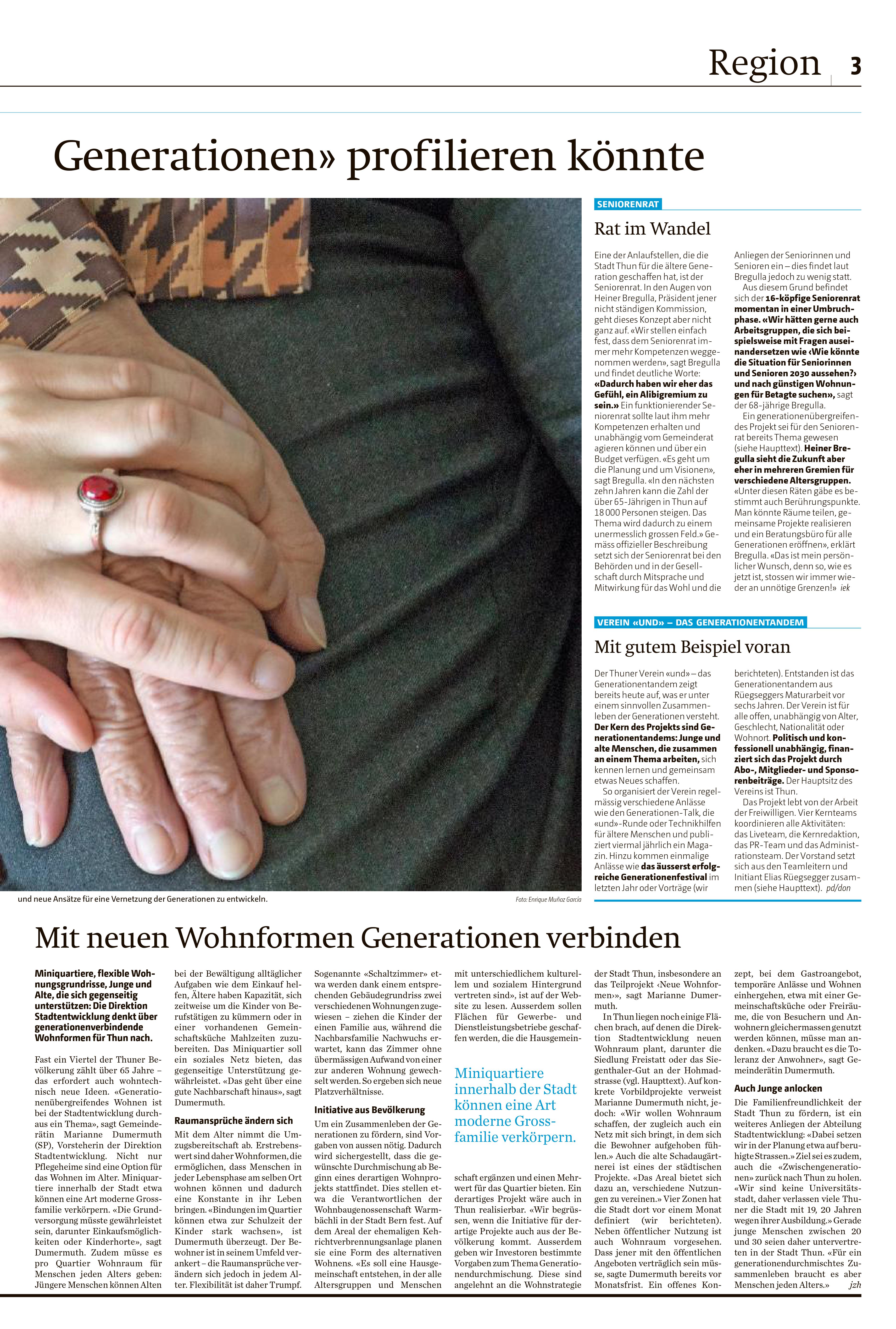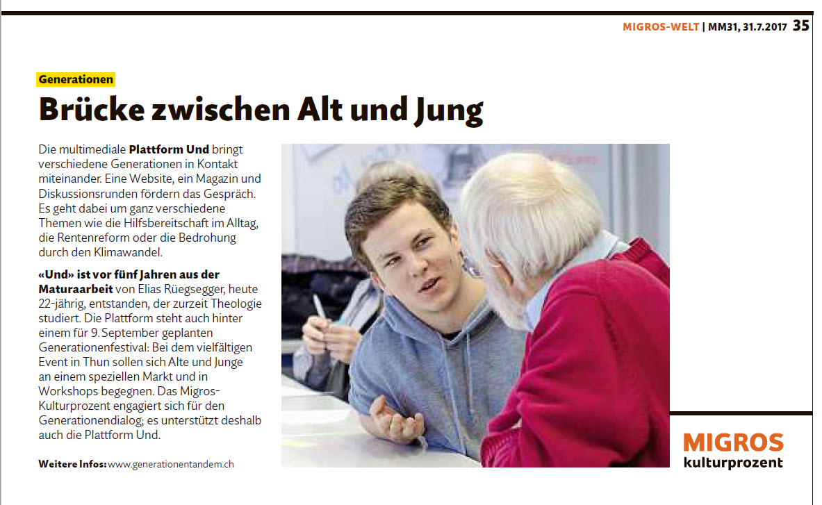 Vor sieben Jahren angestossen durch eine Maturarbeit, ist das einzigartige Projekt aus Thun in der letzten Zeit immer grösser geworden und überzeugt mittlerweile mit einem ausgesprochen professionellen Auftritt. „Und“ – Generationentandem ist aber nicht nur ein regelmässig erscheinendes Magazin, sondern in allererster Linie eine Plattform, die junge und alte Menschen in Kontakt bringen will. An den unterschiedlichsten Anlässen kommen die verschiedenen Generationen zusammen, diskutieren über gesellschaftlich relevante Themen und lancieren gemeinsam neue Projekte. So etwa auch das Generationenfestival welches nun bereits zum zweiten Mal ausgetragen wird und am kommenden Wochenende in Thun über die Bühne geht.