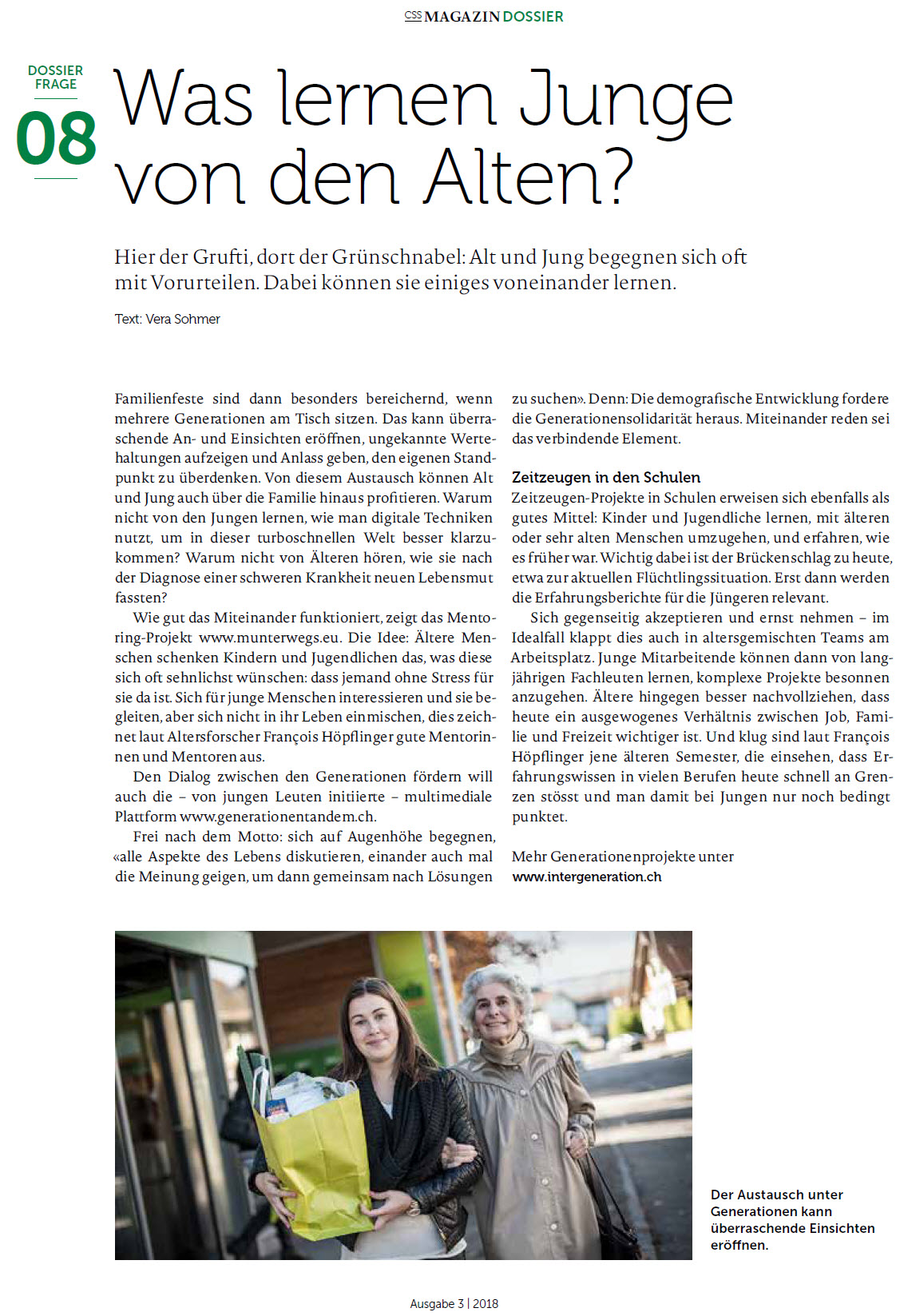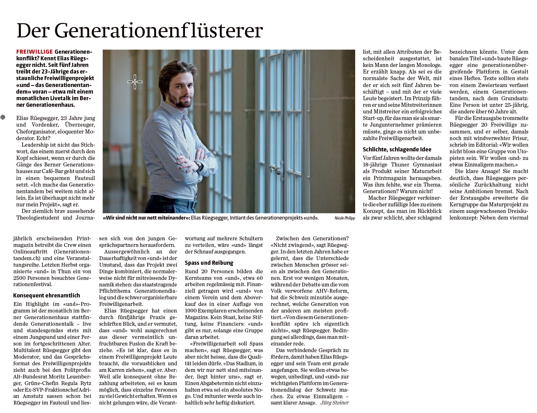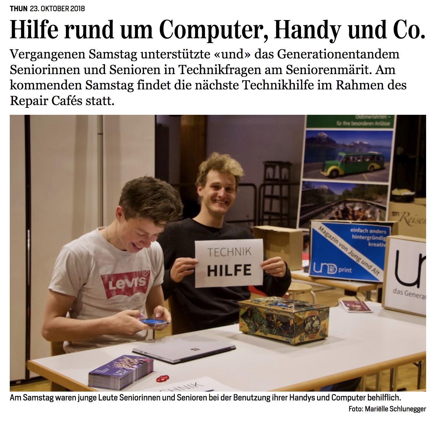 Vor sieben Jahren angestossen durch eine Maturarbeit, ist das einzigartige Projekt aus Thun in der letzten Zeit immer grösser geworden und überzeugt mittlerweile mit einem ausgesprochen professionellen Auftritt. „Und“ – Generationentandem ist aber nicht nur ein regelmässig erscheinendes Magazin, sondern in allererster Linie eine Plattform, die junge und alte Menschen in Kontakt bringen will. An den unterschiedlichsten Anlässen kommen die verschiedenen Generationen zusammen, diskutieren über gesellschaftlich relevante Themen und lancieren gemeinsam neue Projekte. So etwa auch das Generationenfestival welches nun bereits zum zweiten Mal ausgetragen wird und am kommenden Wochenende in Thun über die Bühne geht.