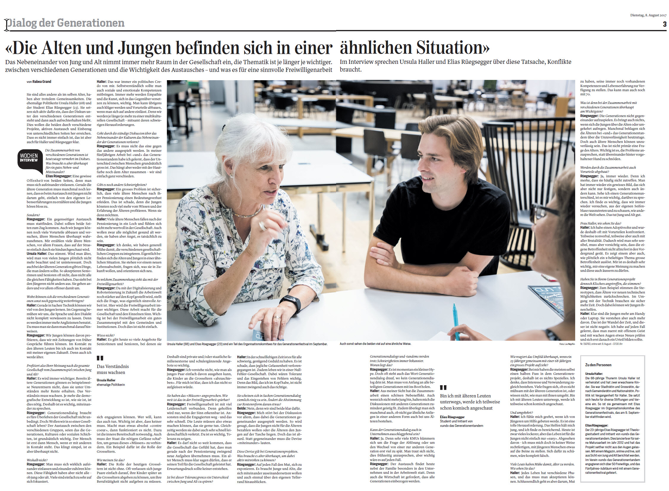 Salim Staubli war für uns beim „Generationentandem“ zu Besuch und sprach mit Elias Rüegsegger (25) und Annemarie Voss (74) über die Erfolgsgeschichte von UND Generationentandem: