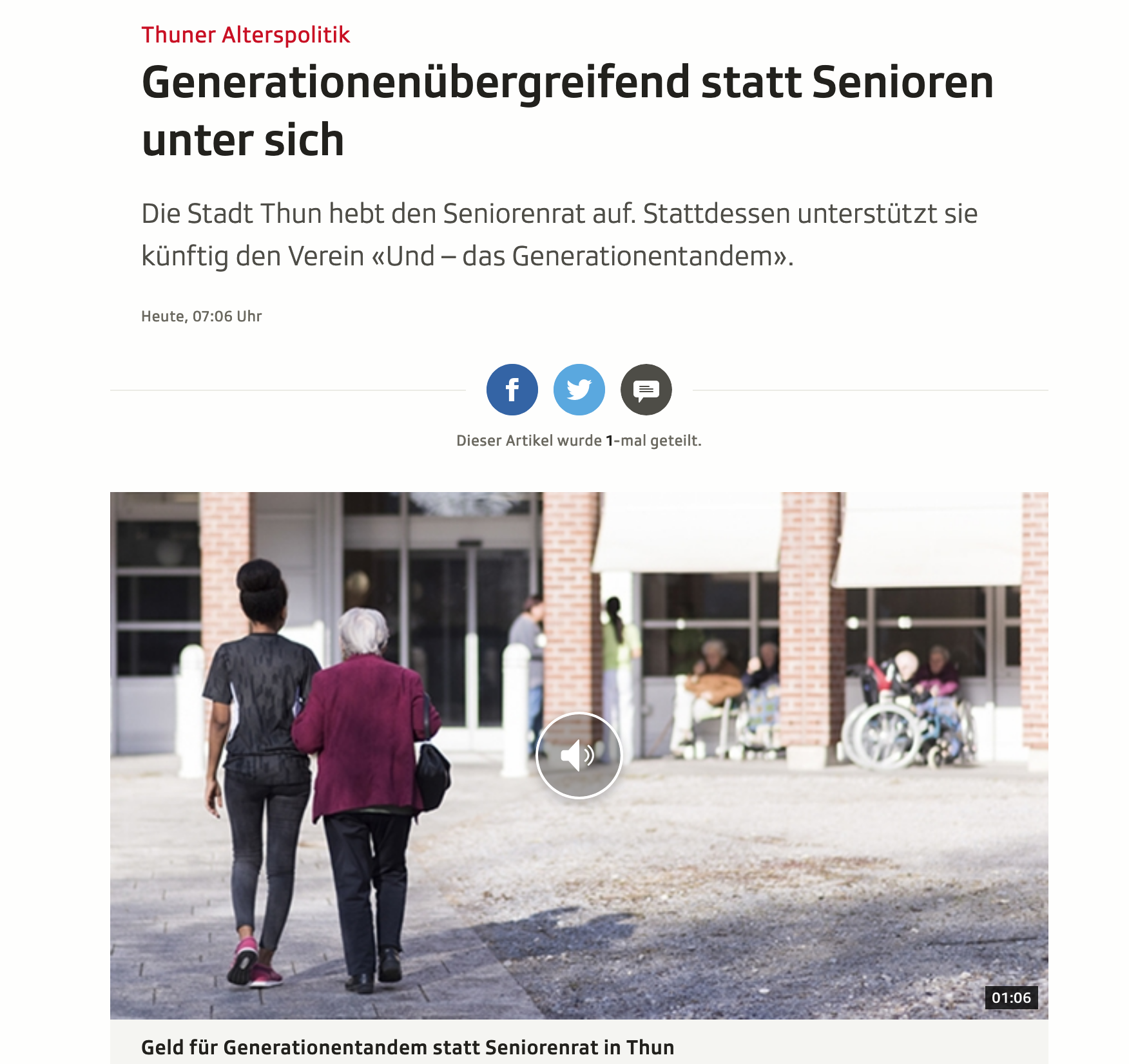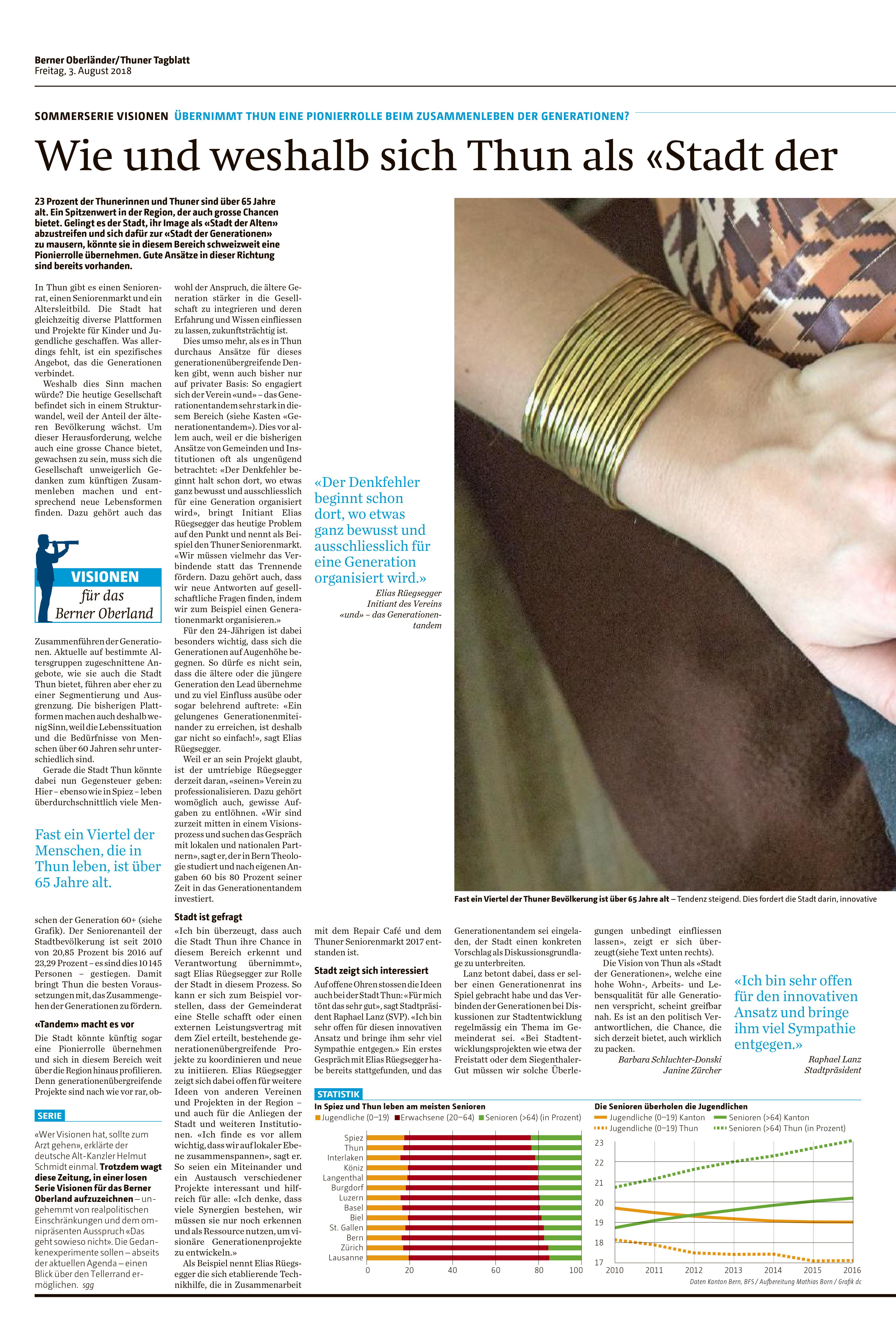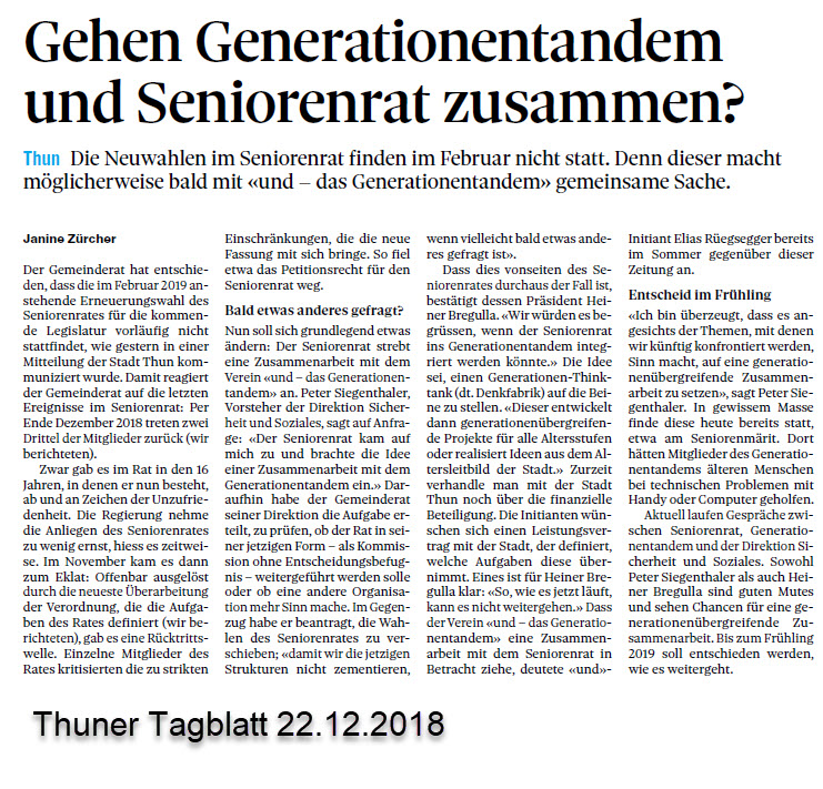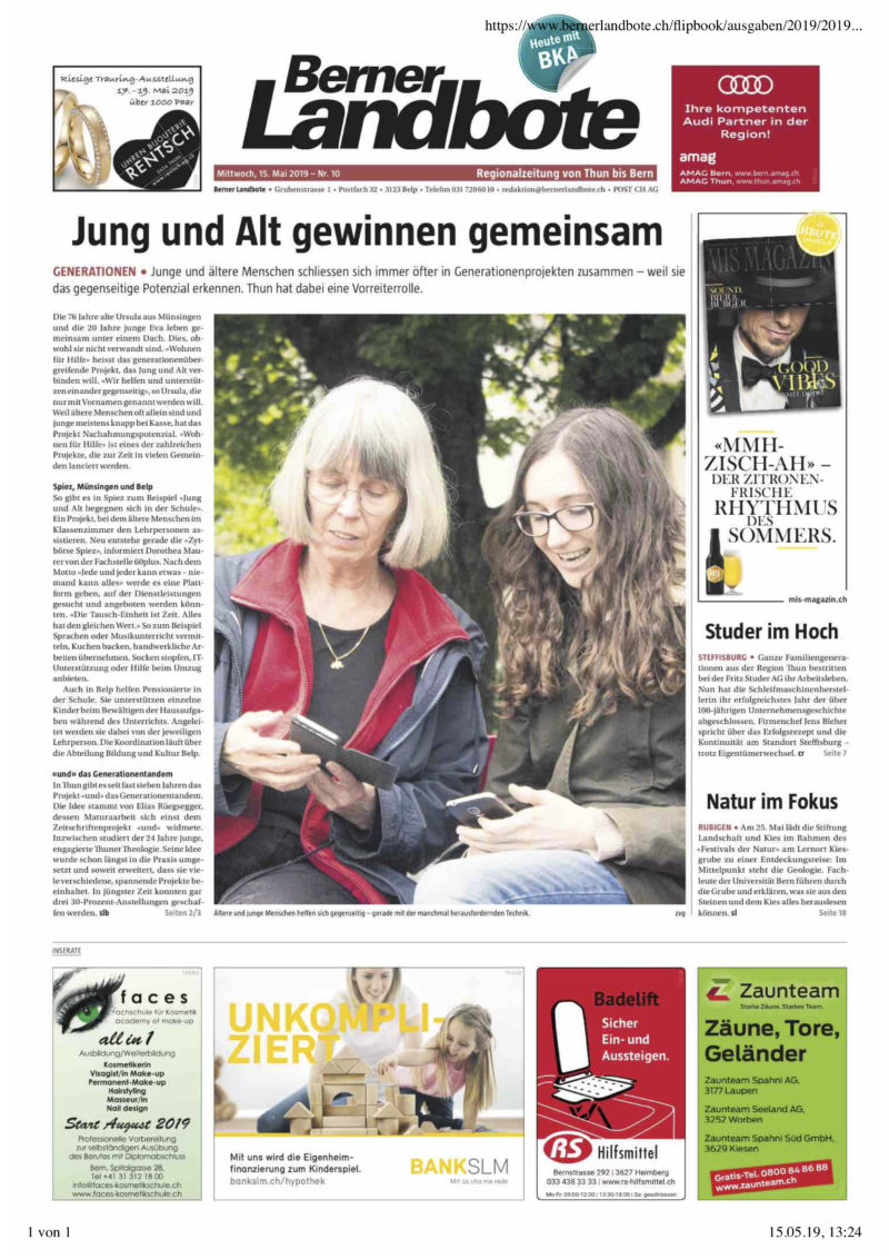 2. April 2019 | Miteinander der Generationen wird gestärkt | Thuner Tagblatt, Andreas Tschopp, Online
