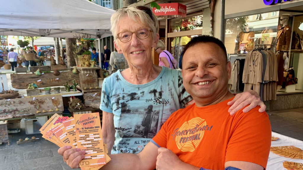 Freitag, 13. September 2024, 18 Uhr: Vor dem ersten Auftritt auf der Aussenbühne bitten die Moderator:innen die Co-Präsident:innen Livia Thurian (29) und Erika Kestenholz (76) auf die Bühne. Die beiden sind das Tandem-Gesicht des Vereins hinter dem Generationenfestival.