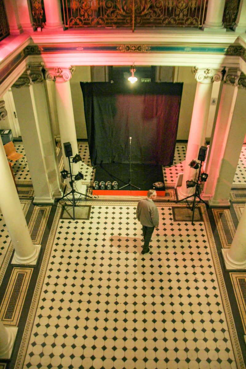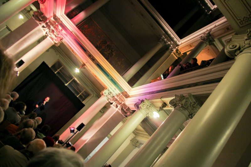 175 Menschen standen und sassen im zur Slam-Arena umfunktionierten Foyer des Thunerhofs. Auf der Treppe sowie am Geländer lehnend, suchte das generationendurchmischte Publikum den besten Blick zur Bühne. Schwarzer Hintergrund, ein Mikrofon und farbige Lichter erzeugten im ehemaligen Grandhotel eine einmalige Stimmung. Nach einer kurzen Einführung machten sich die SlammerInnen und das Publikum auf ins Museum. Jeder der Spoken-Word-PoetInnen hatte ein Bild ausgewählt. Je ein Viertel der ZuschauerInnen versammelte sich vor einem Bild.