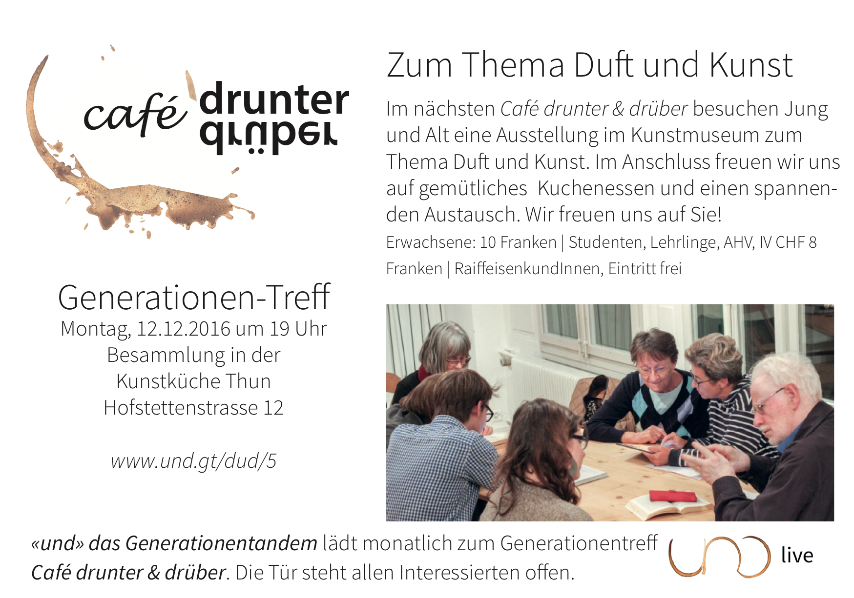 UND Generationentandem lädt zum Café drunter & drüber in der Kunstküche. In der Kunstküche treffen sich Jung und Alt, Du und Ich in unkompliziertem Rahmen. Gespräche über Gott und die Welt, der Austausch, die Begegnung sind das Ziel. Die Tür steht allen Interessierten offen.