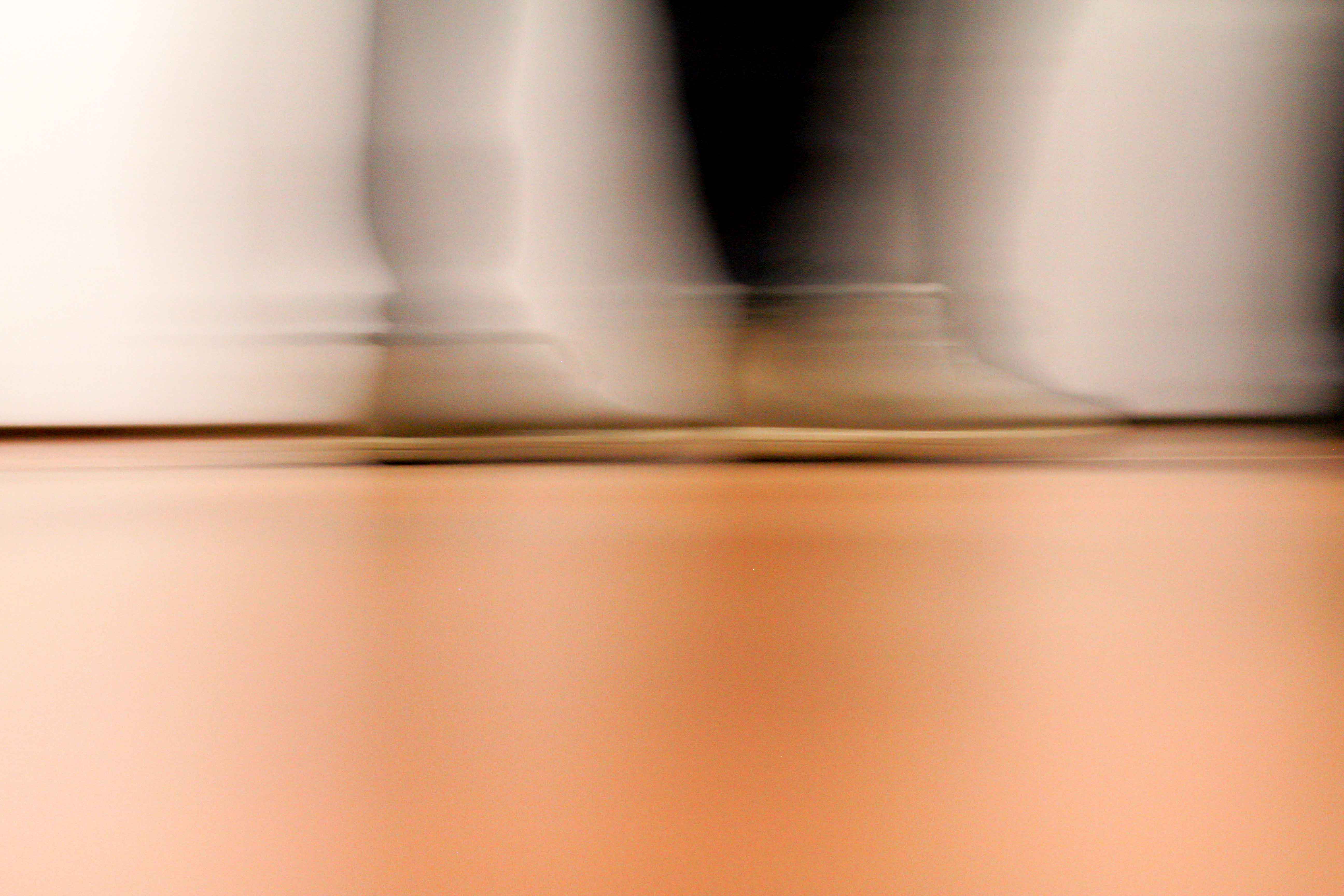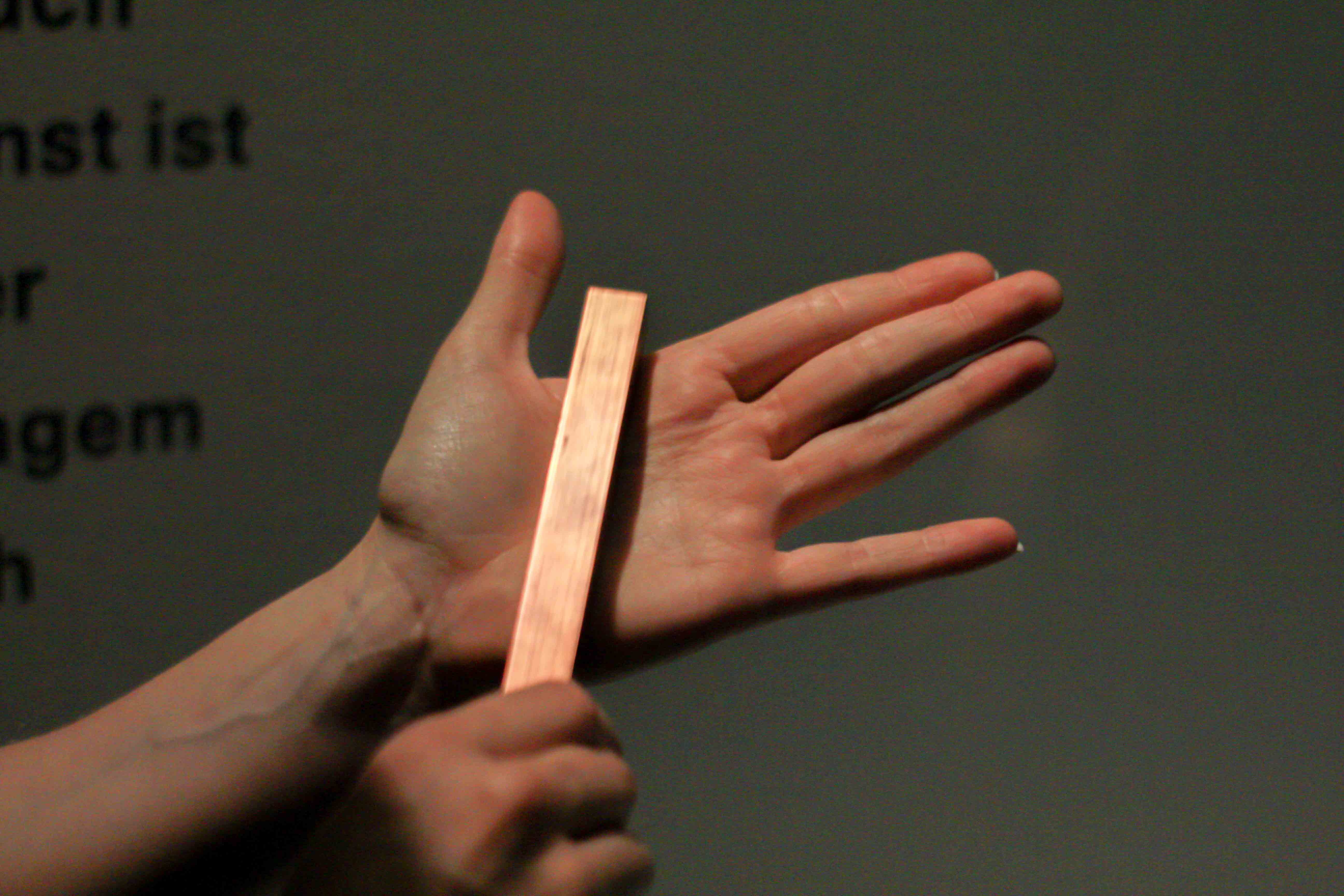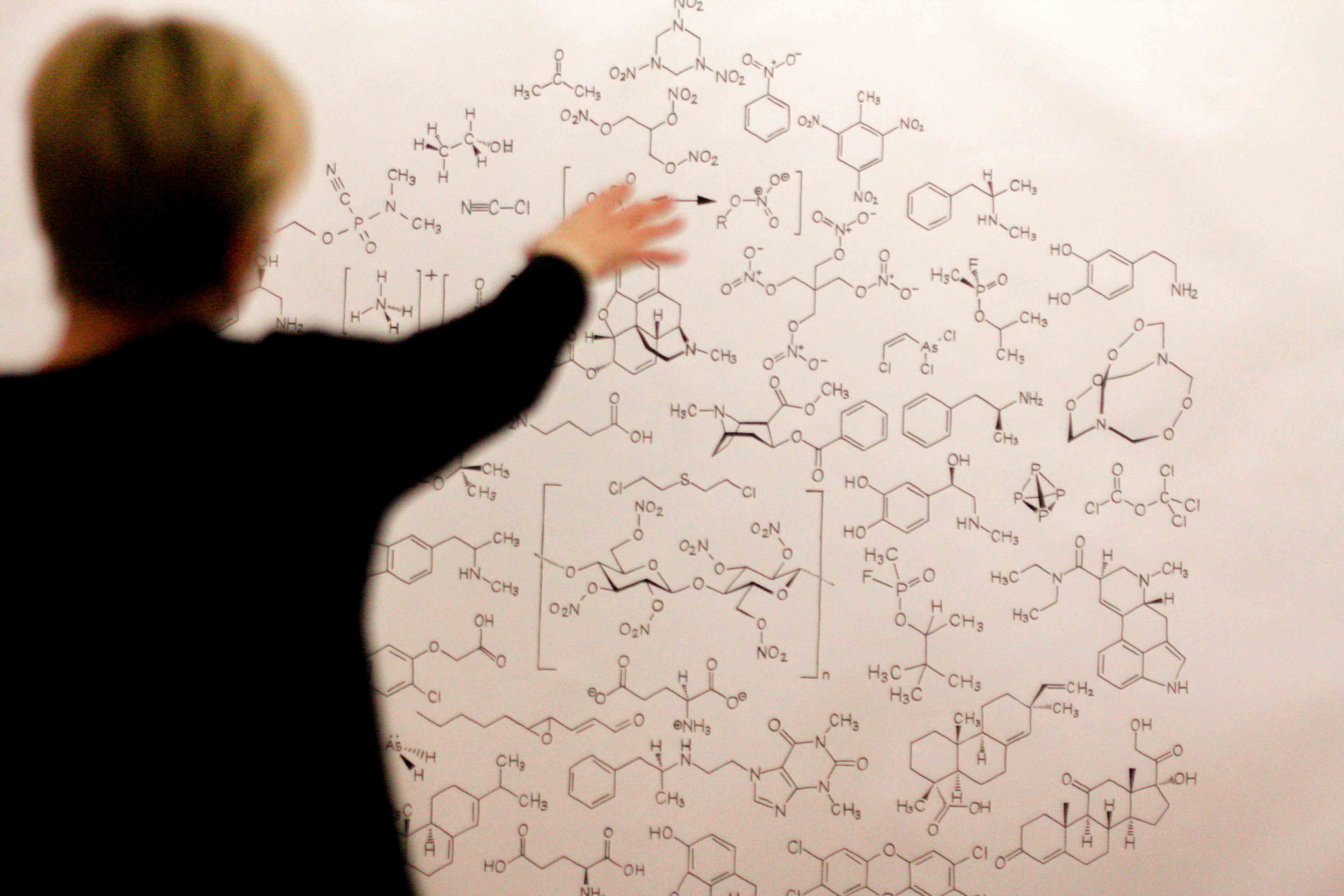 Bewegung – auf zum nächsten Gefäss. Riecht das nach Parfüm? Oder doch nach Tinte? Es ist ein Gemisch aus einem schrechlick riechenden Parfüm und Tinte: Damit hat der Künstler Habib Asal dann diese Molekülstruktur aufgezeichnet. Der ganze Raum riecht nach dieser Tinte, nach diesem Parfüm. Assoziationen an allerlei körperliche Ausscheidungen sollen bewusst geweckt werden. Iih! Wäh! Wieso? Hmm…