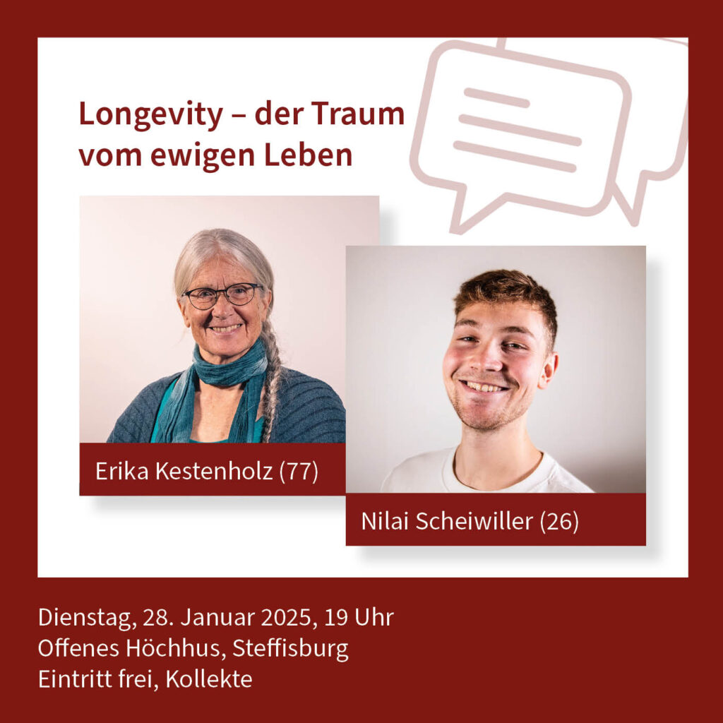 Der Generationentalk «Longevity – der Traum vom ewigen Leben» muss aus gesundheitlichen Gründen abgesagt werden. Wir freuen uns jedoch, euch stattdessen zu der Ersatzveranstaltung – ein lockeres Gespräch – mit Erika Kestenholz (77) und Nilai Scheiwiller (26) einzuladen.