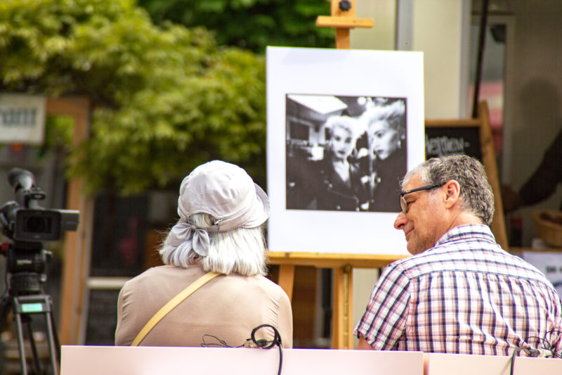 Bruno Amstutz (64) und Gaby Jordi (67) betrachten unter der heissen Sonne auf der Panzerpiste die Fotografie «Jacky» von Reto Camenisch.