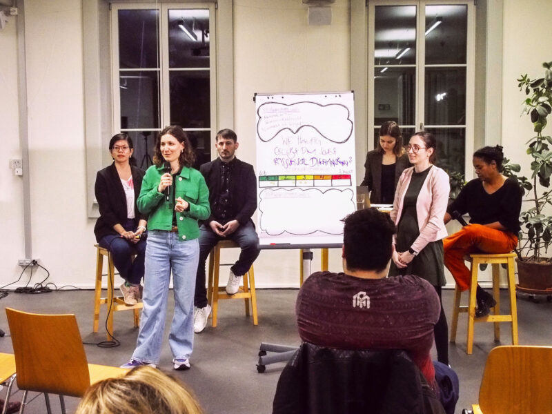 Damit übergeben sie das Wort an Tabea Keller (24), der Moderatorin des Abends, die dieses Resultat auch gleich mit Zahlen bestätigt: 27 Prozent der gemeldeten rassistischen Vorfällen, passierten im Bildungsbereich. Sie verspricht, dieses Thema mit ihren Gästen zu vertiefen.