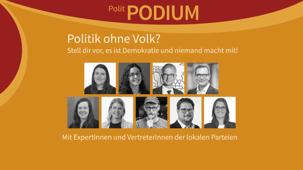 Darüber möchten wir sprechen. Wer geht nicht abstimmen? Und aus welchen Gründen? Oder konstruktiv: Was braucht es, damit mehr Menschen abstimmen und wählen gehen? Welche Ideen gibt es auf lokaler Ebene? Wie können insbesondere die jüngeren Menschen noch besser erreicht werden? Auf dem Podium sprechen ExpertInnen und lokale PolitikerInnen: Welche Ideen, Ansätze, Bedenken für eine höhere Stimmbeteiligung haben sie?