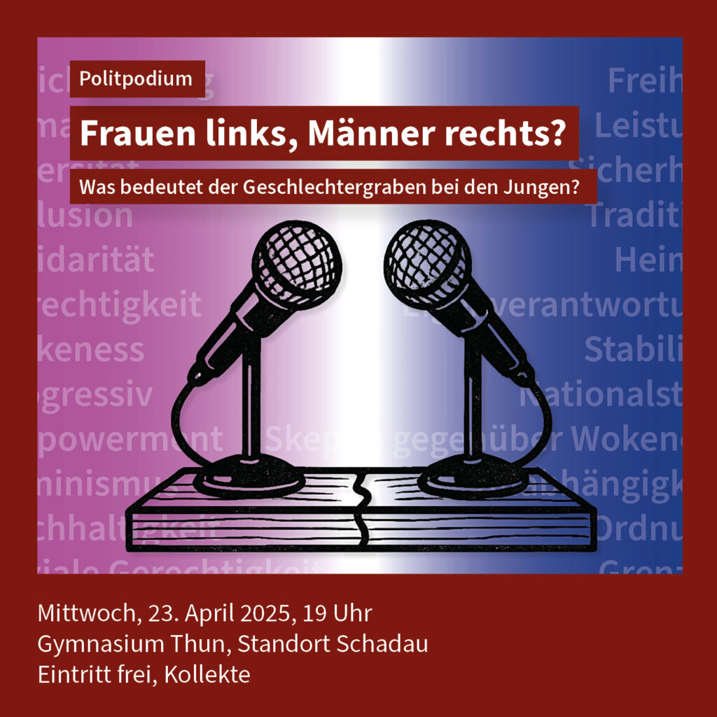 Immer öfter zeigt sich: Junge Frauen und junge Männer in der Schweiz ticken politisch ganz unterschiedlich. Viele junge Frauen stehen links, viele junge Männer eher rechts. Eine SRG-Umfrage zeigt zum Beispiel: Die Mehrheit der jungen Männer hält Debatten über Gender und Wokeness für übertrieben – viele junge Frauen sehen das ganz anders. Auch eine Untersuchung von Sotomo aus dem Jahr 2023 bestätigt diesen Trend. Warum ist das so? Was steckt dahinter? Und was bedeutet diese Entwicklung für unsere Gesellschaft? Diese und weitere Fragen diskutieren wir am nächsten Politpodium von UND Generationentandem.