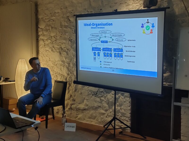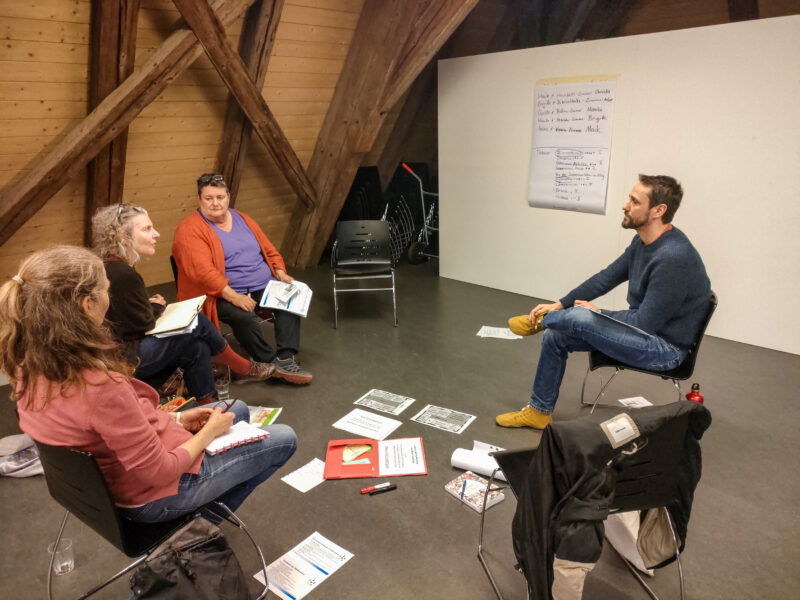 Nach einem kurzen Theorie-Input von Kursleiter Christian Rüther zu den Anfängen der Soziokratie, zum Begriff Konsent und zur Methode der Konsentmoderation werden nach dem Zufallsprinzip vier Gruppen gebildet für das WG-Spiel. Mit einer der Gruppen moderiert Christian eine Konsentfindung als Demo.