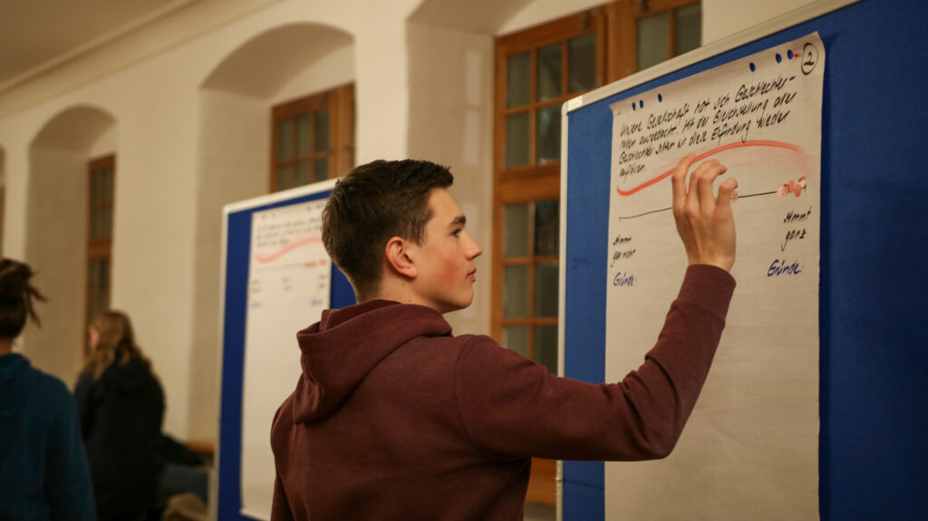 Die Besucher:innen – viele Junge sind dabei – drängen sich in der Vorhalle zum Stadtratssaal um vier Flipcharts. Bereits vor der Veranstaltung hatten sich die vier Podiumsgäste je einen prägnanten Satz ausgedacht, zu denen sie Stellung nehmen konnten. Rote Punkte zeigen den Grad des Einverständnisses an, Kommentare werden hingekritzelt.