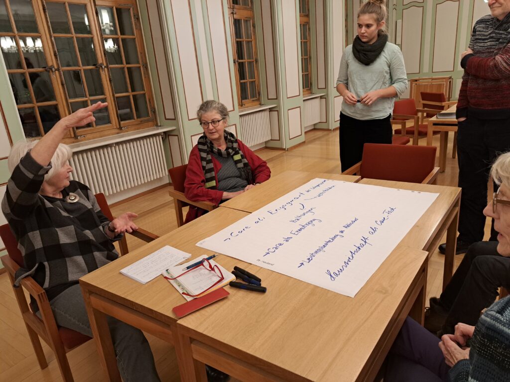 Verschiedene Ideen kamen zur Sprache, wie dem Anliegen der Care-Arbeit konkret entsprochen werden könnte. Doch grundsätzlich wurde klar: Jede Lösung setzt voraus, dass wir umdenken lernen, weg von der überwiegenden Ich-Mentalität hin zum Bewusstsein, dass wir alle voneinander abhängig und füreinander verantwortlich sind. Neben dem bedingungslosen Grundeinkommen, das auch hier Zustimmung fand, wurde unter anderem der Vorschlag gemacht, jedem Kind solle bei seiner Geburt ein Ausbildungsbeitrag zugesprochen werden, den er oder sie zu geeigneter Zeit einsetzen könnte.