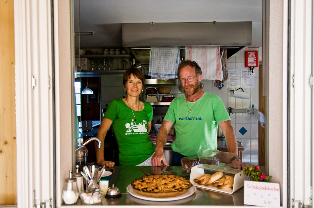 Wir kochten so natürlich wie möglich und verwendeten weitgehend Rohprodukte. Ich mahlte das Getreide für unser Vollkornbrot selbst und stellte auch Sauerteig her. Wir kochten, was wir auch selbst gerne hätten essen wollen. Bei vielen Gästen kam es zum Aha-Erlebnis. Wenn ich Risotto mit Vollkornreis oder Bulgur zubereitete, ging die Diskussion an den Tischen los. Was ist denn da wohl drin? Doch die meisten waren positiv überrascht. Anfänglich kultivierten wir einen kleinen Garten, bis die Kühe ihren Gefallen daran fanden… Eine Bereicherung waren speziell die Wildkräuter, welche ich sammelte, oder der Quittenbaum für den Quittengelee. In einem grossen Topf liess ich jeweils Sauerkraut gären.