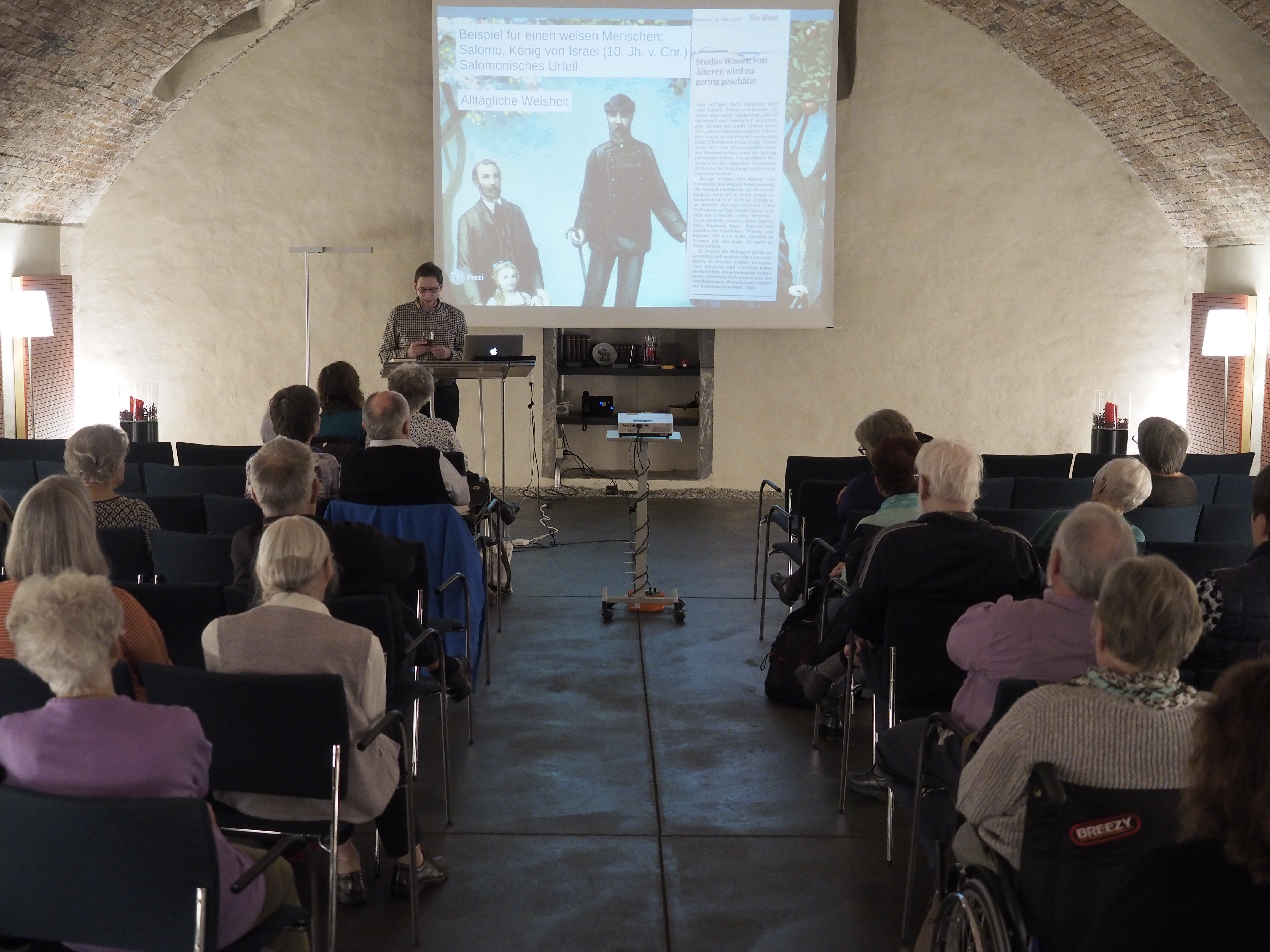 Das Thema des Vortrages «Weisheit – gewinnbringender Austausch zwischen Generationen» lockt einige, vorwiegend ältere Menschen in den Gewölbekeller des Tertianums. Sofort fällt einem die auf eine Leinwand projizierte «Lebenstreppe» ins Auge.