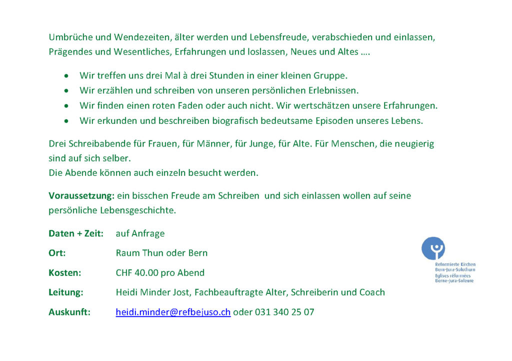 Im biografischen Schreiben geschieht eine solche Würdigung von sich selber und von Anderen. In der Rekonstruktion des eigenen Lebens kann ein roter Faden gesponnen werden. Dabei findet eine Sinnstiftung und eine Versöhnung mit dem Gelebten und Erlebten statt. Biografisches Schreiben und Erzählen ist aber auch zukunftsgerichtet: Durchs Aufschreiben und Erzählen der eigenen Geschichte oder eigener Lebenssplitter bilden sich neue Wege, wie Zukunft bewältigt werden kann: Neue Lebensgestaltungsmöglichkeiten entstehen.