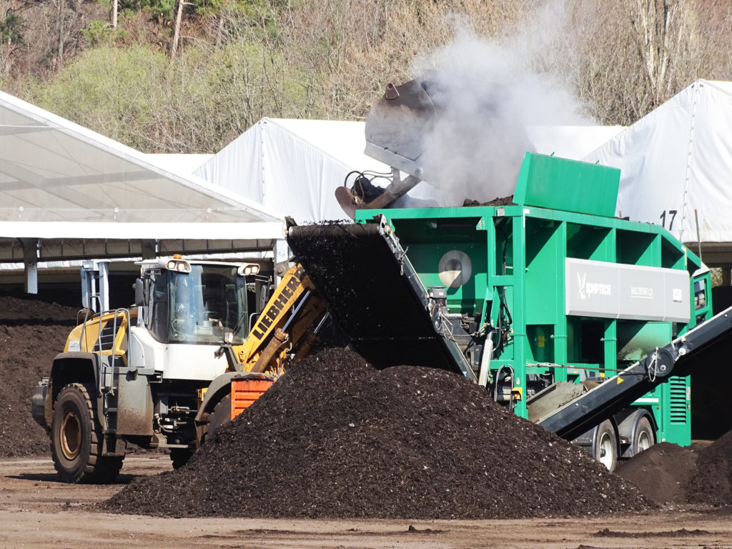 Nachdem die holzigen Teile aussortiert sind, wird das vergärbare Grüngut zu hochwertigem Bio-Kompost verarbeitet. Das geschieht in vier Schritten: Zuerst wird das Material mechanisch zerkleinert. Dann wird die zerkleinerte Biomasse in Gärbehälter, sogenannte «Fermenter», gefüllt. Später vergärt die Masse unter Luftabschluss. Durch die Aktivität von Bakterien entsteht unter kontrollierten und optimierten Bedingungen Methangas. Damit kann in zwei Blockheizkraftwerken Strom produziert werden. Der Überschuss an Wärme wird an externe VerbraucherInnen verkauft, der Strom geht ins Netz. Nach 20 bis 30 Tagen kommt die vergorene Biomasse in die Kompostieranlage. Dank der Überdachung und einer sorgfältigen Pflege kann das Endprodukt unter guten Bedingungen heranreifen. Es ist Qualitätskompost, ausgezeichnet mit dem Label von Bio Suisse.
