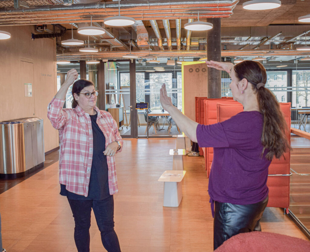 Estelle: Als ich etwa fünf Jahre alt war, spielte mir mein Vater auf dem Handy Songs vor, die von Gebärden begleitet wurden. Dies als Vorbereitung auf ein Treffen mit der gehörlosen Tochter von Bekannten. Wir fanden im Spiel rasch zueinander. Mir erschien es magisch, wie sie und ihre Familie sich mit Gebärden offenbar so ausdrücken konnten wie wir mit Worten. So beschloss ich, diese Magie auch irgendwann zu erlernen.