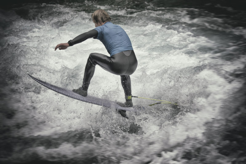 Bei der Mühleschleuse tritt auch eine Welle in Erscheinung. Im Vergleich zur Scherzligwelle ist sie höher, steiler, liegt näher an der Schleuse; die Strömung ist schneller und treibt SurferInnen auf den Brückenpfeiler zu; in der Untiefe lauern kantige Felsen – summa summarum: empfohlen nur für Erfahrene. Aus diesem Grund gibt es dort so gut wie keine Warteschlangen. Als Mario vor einiger Zeit an der Mühlewelle sein Können zum Besten gab, geriet die Nase seines Boards unter Wasser und zerschellte auf den Flussohlefelsen. Die Lust auf nächste Versuche an der Mühlewelle ist Mario danach vorläufig vergangen. Colette surft regelmässig auf beiden Wellen, aber einige ihrer Bretter haben an der Mühlewelle ebenfalls gelitten. «Einige», weil Colette elf Surfboards besitzt. «Es gibt Frauen, die viele Schuhe als ihr Eigen nennen, und ich besitze halt elf Bretter», bekennt sie nach einem Nachbohren und lacht. Ihr Liebling ist das SWN Surfboard, ein besonders für die Thuner Wellen geeignetes, in der Nähe der Mühlewelle angefertigtes Brett. Der Produzent und Thuner Surfer der ersten Stunde in einem, ist ein grosses Vorbild in der Surftechnik für Colette. Der Verein Flusssurfen Thun plant am 1. September 2018 einen Event – «River Surf Jam» – an der Mühlewelle durchzuführen.