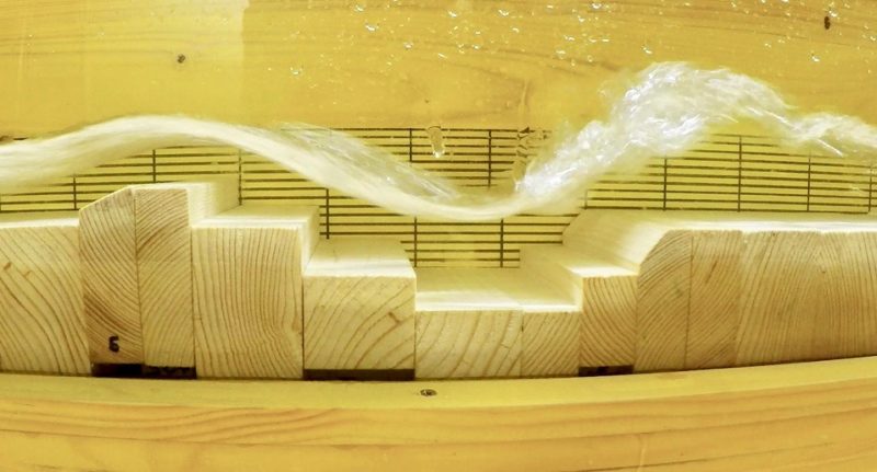 In seinem Modell schuf Mario eine hohe, steile Welle mit Schaumkrone, wenn im Untergrund zuerst eine kleine Schwelle, danach ein treppenartiger Ab- und Aufgang vorhanden waren.
