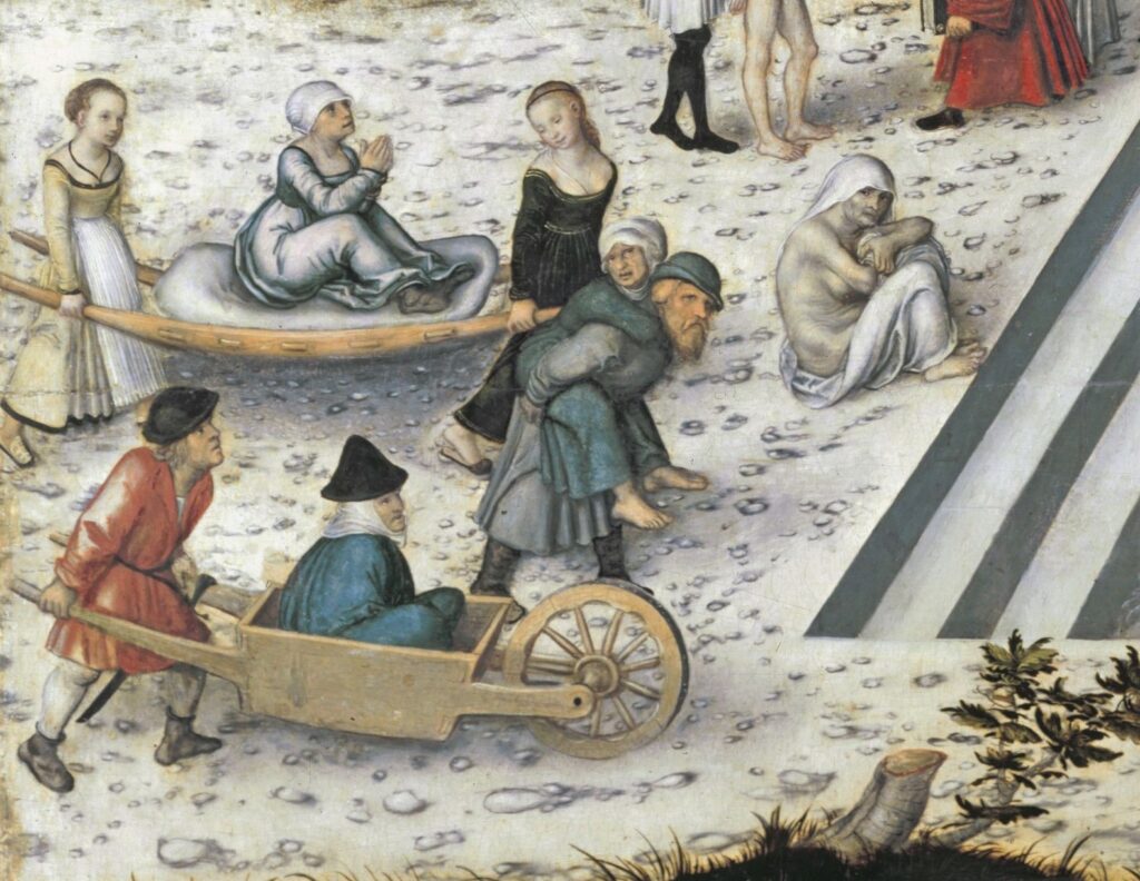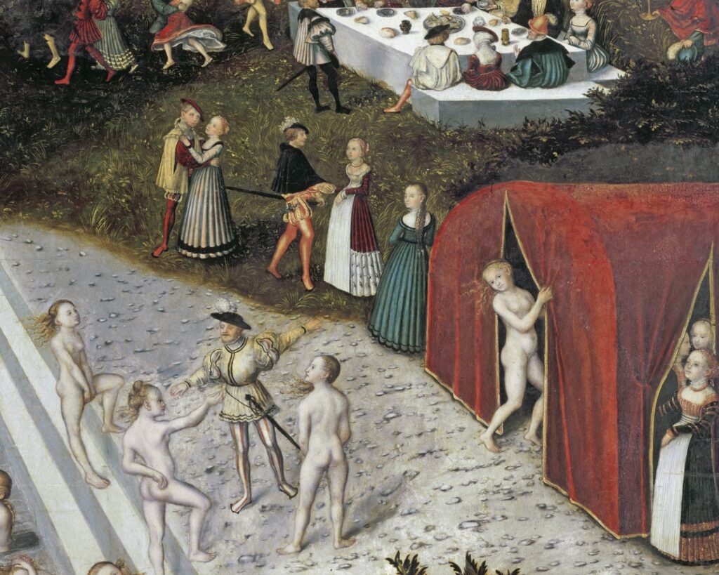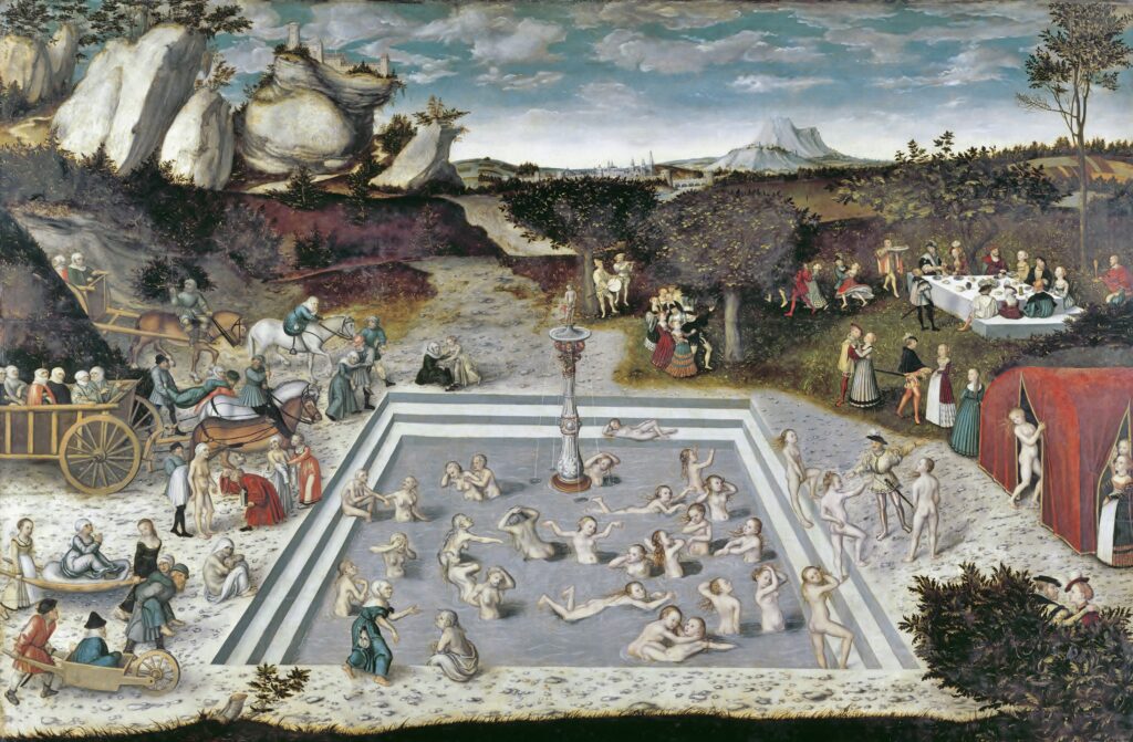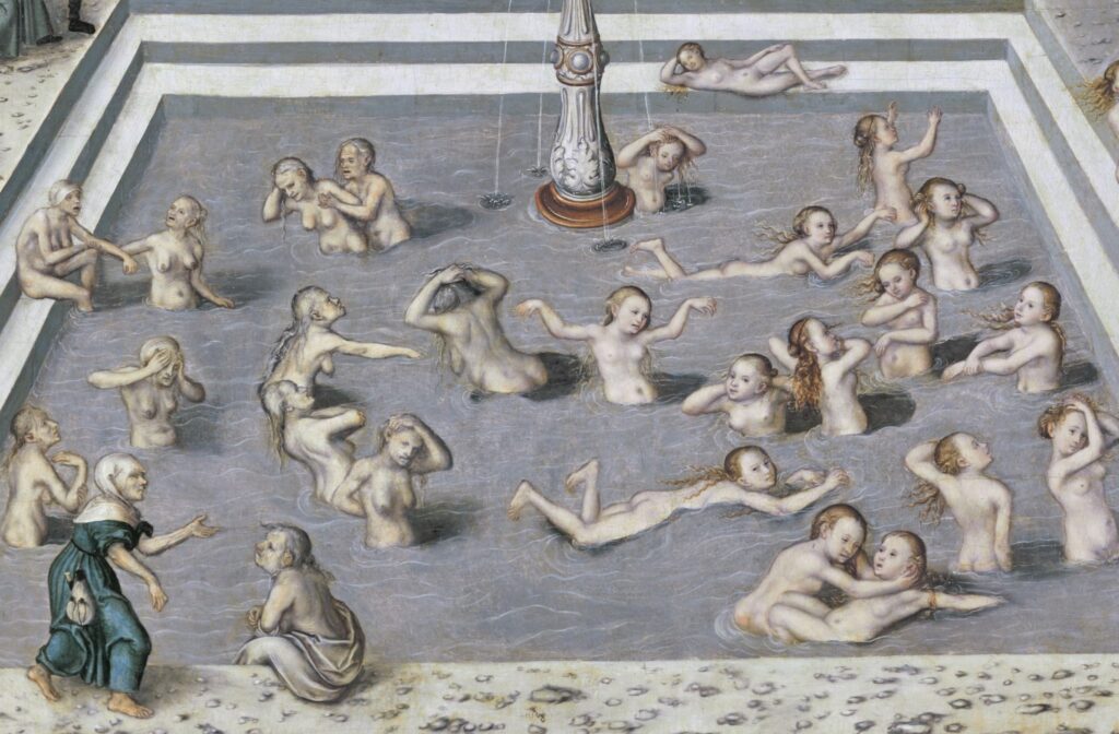 Die reinigende, heilende Wirkung des Wassers spielte auch in den Religionen seit jeher eine zentrale Rolle, insbesondere in den Taufriten, welche die innere Verwandlung und Läuterung der Täuflinge zum Ziel hatten. Das Gemälde von Cranach zeigt im Gegensatz dazu eine äussere Verwandlung: Alte Bürgerinnen, Adelsfrauen und Nonnen werden auf Wagen und Schubkarren zum Jungbrunnen gebracht, wo sie von Badepersonal betreut werden, bevor sie ins Wasser steigen, dessen verjüngende Kraft am eigenen Leib erleben und schön, frisch und gesund aus dem Bad steigen.