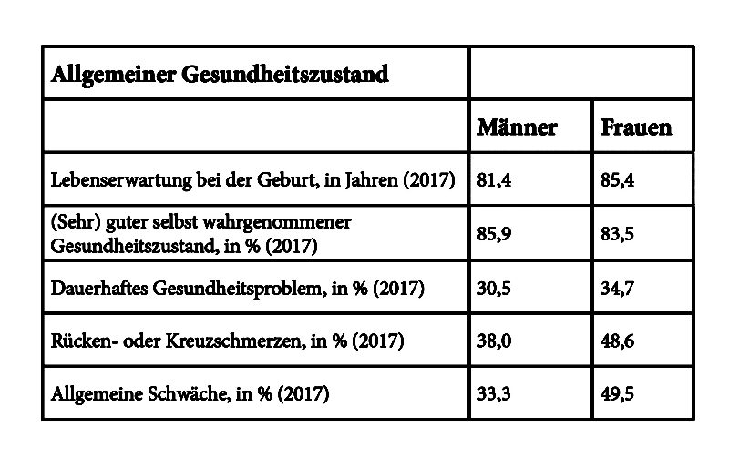 René: Das wird in etwa ausgeglichen sein, Männer verhalten sich – vor allem in ihrer Jugend – risikoreicher als Frauen, insbesondere, was Sport betrifft. Je älter man wird, desto mehr dauerhafte Gesundheitsprobleme entstehen.