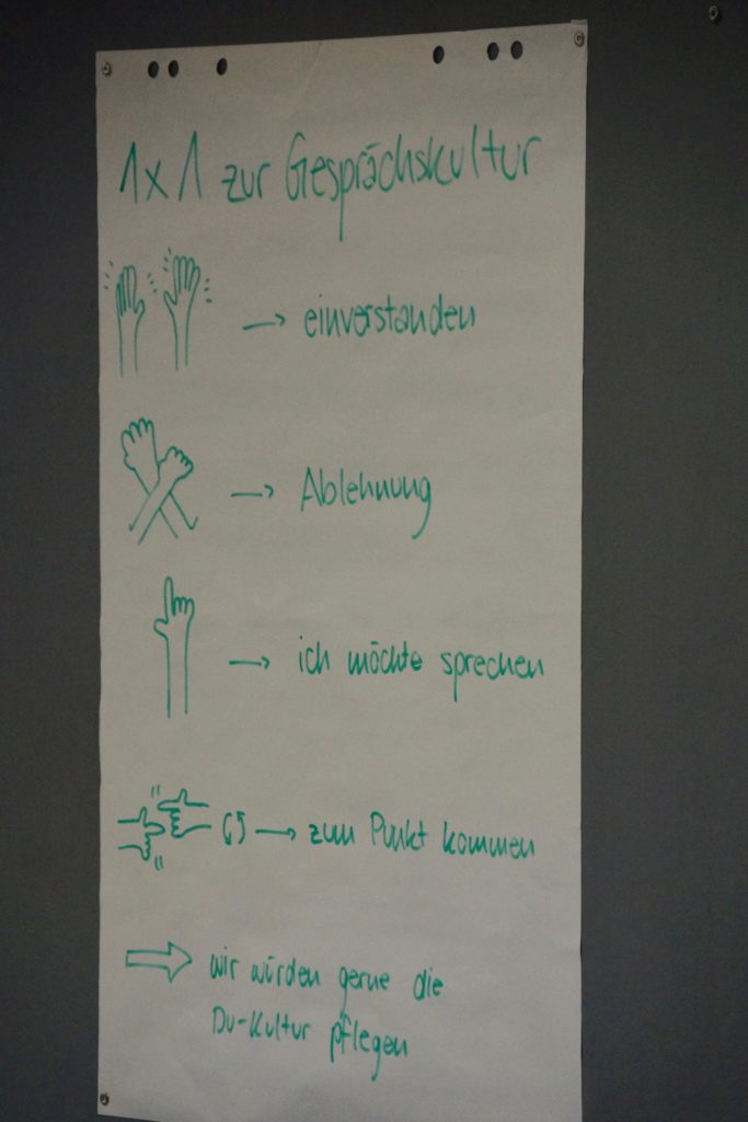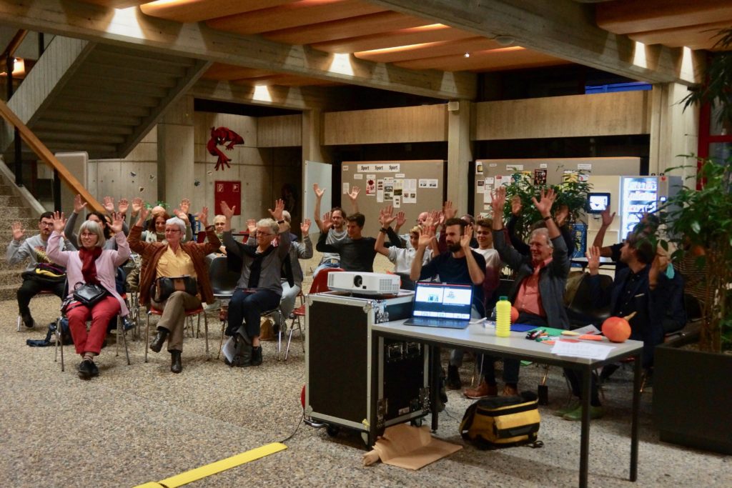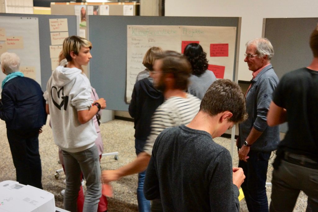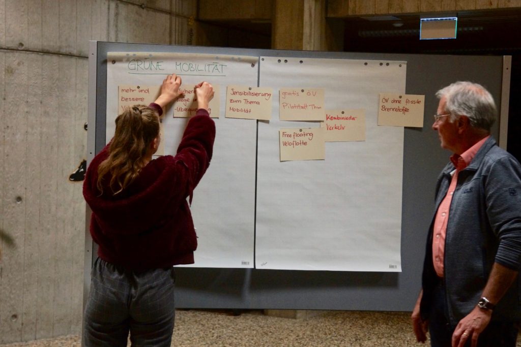 Nach den Inputreferaten diskutierten die TeilnehmerInnen in drei Kleingruppen über die drei Themen. – Bild: Lisa EssigBild: Lisa EssigDoch zunächst wurden noch die Diskussionsregeln definiert. So wurden die Gesten aus dem Umfeld des Klimastreiks aufgenommen für Zustimmung… – Bild: Lisa Essig…und Ablehnung. – Bild: Lisa EssigDie Workshops in Kleingruppen. – Bild: Lisa EssigDie Diskussionsregeln. – Bild: Lisa EssigDie Ideen für konkrete Massnahmen wurden gesammelt. – Bild: Lisa EssigZum Schluss wurden die einzelnen Ideen mit Punkten bewertet. Aus jedem Thema kristallisierte sich so ein Thema als «Sieger» heraus. – Bild: Lisa Essig