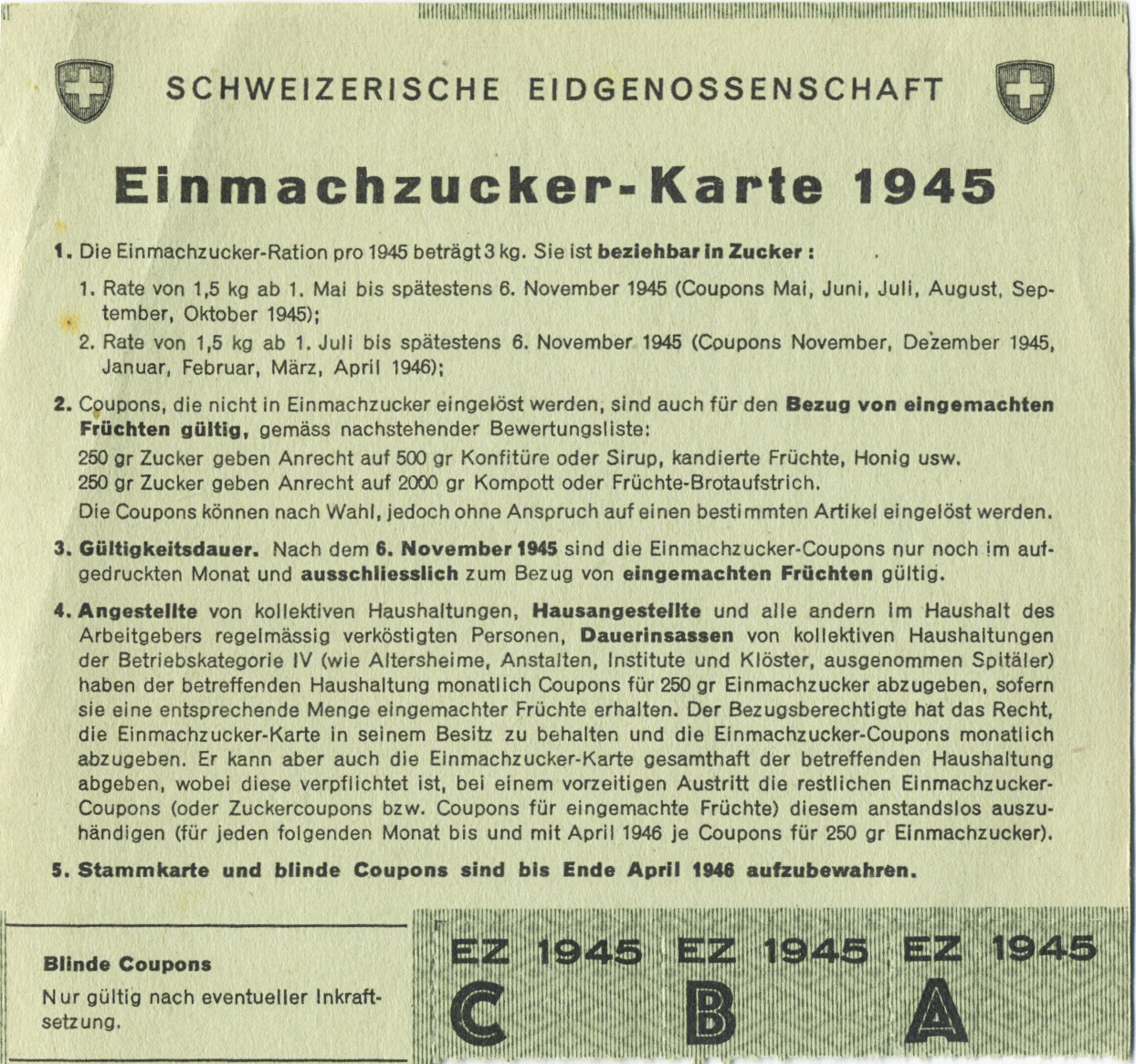 Während der Kriegs- und Nachkriegszeit war die Ernährung in der Schweiz – allgemein gesehen – bescheiden, fettarm und lange Zeit von den Rationierungsmarken abhängig. Diese wurden anfangs des zweiten Weltkrieges eingeführt und jedermann konnte damit die ihm zugeteilte Menge an Lebensmitteln, Toilettenartikeln, Textilien und Schuhen einkaufen.