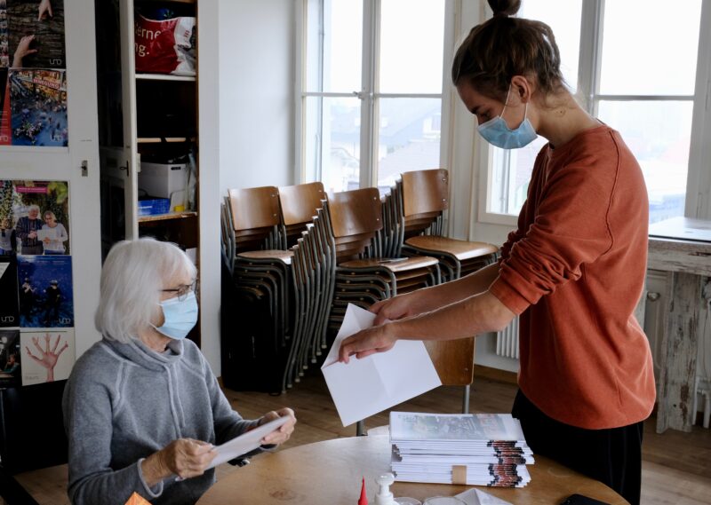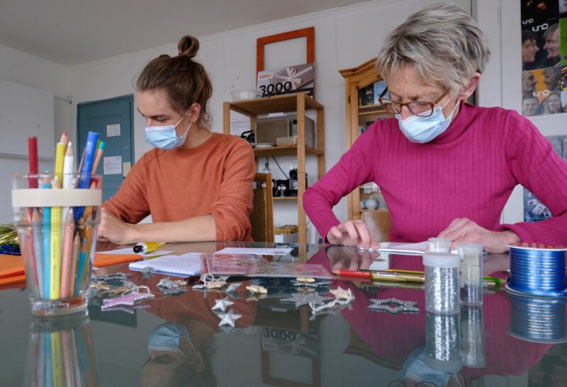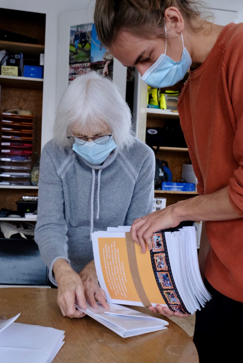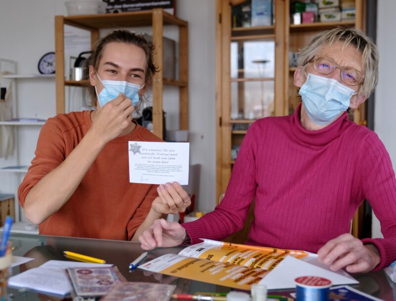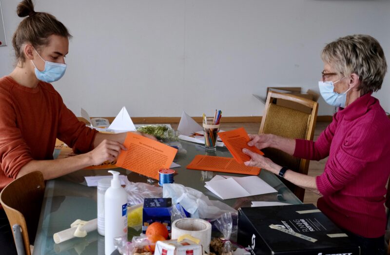 Liselotte Roost (85), Hanna Peter (76) und ich treffen uns, um gemeinsam zu basteln: Dabei stehen nicht nur Weihnachtswünsche im Vordergrund, denn das Wiederverwenden von Papier und alten Plakaten gibt den Briefen einen neuen Schwung und einen ökologischen Wert. Gemeinsam falten wir Briefumschläge und probieren uns an Weihnachtsdekorationen, welche möglichst kreativ gestaltet werden sollten.