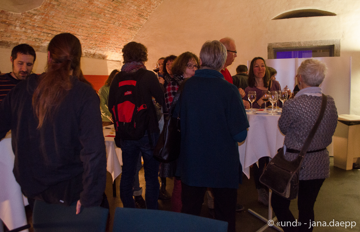 • Viele der knapp 90 BesucherInnen diskutierten bei einem Glas spanischem Wein und einem Stück Pilgerkuchen über ihre Eindrücke.