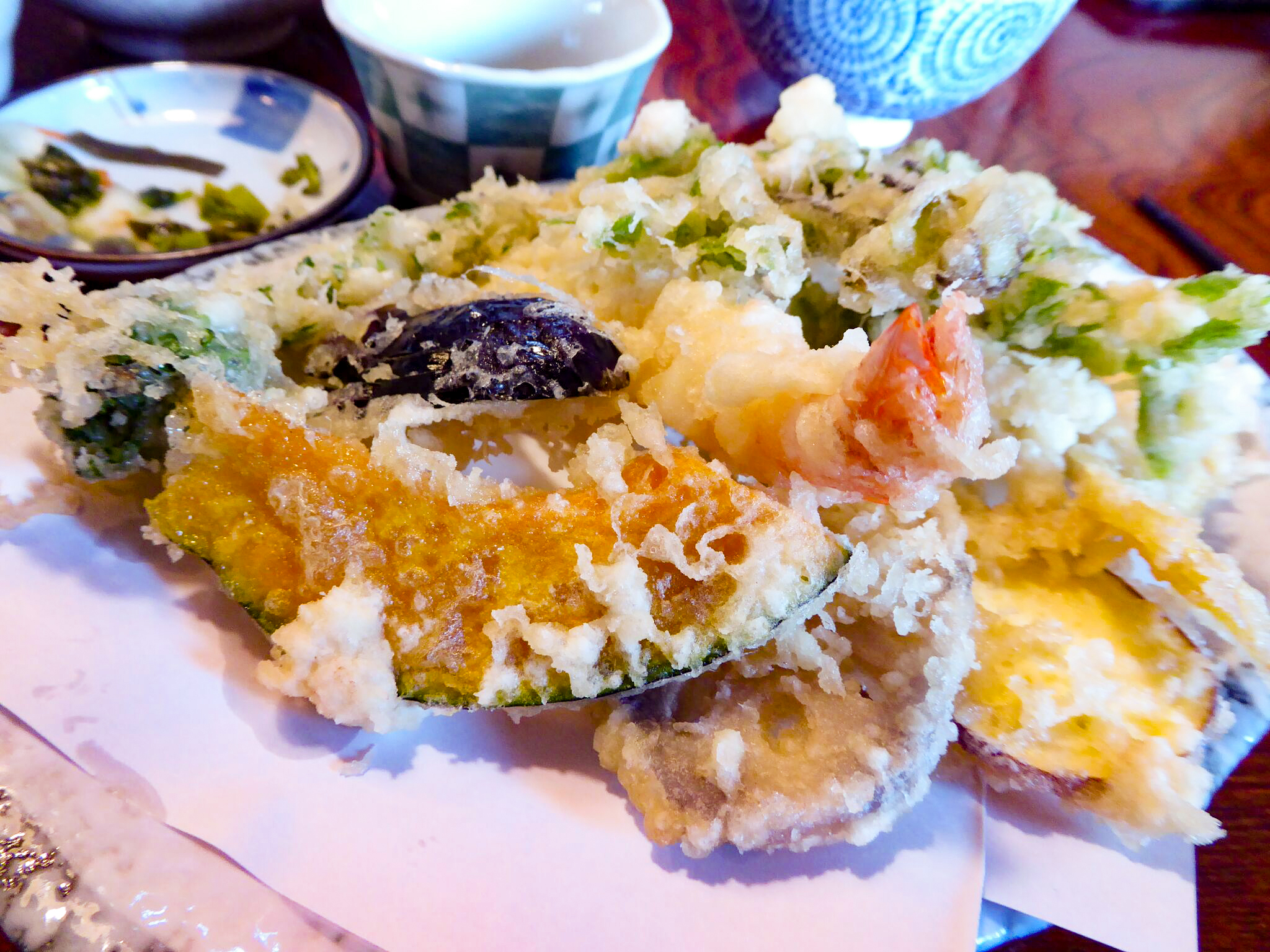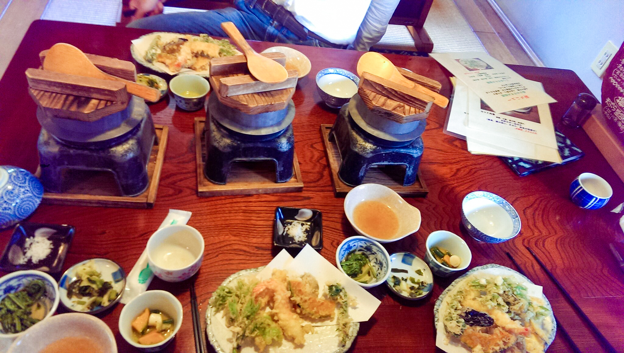 Das japanische Essen besteht vor allem aus Reis (gohan), Fisch, Fleisch, Soja, Algen und Meeresfrüchten. Aus diesen Grundnahrungsmitteln gibt allerlei Kombinationen. Miso- Soup ist traditioneller Bestandteil jeder japanischen Mahlzeit. Die Miso Paste wird aus Sojabohnen, Salz und einer speziellen Art Hefe gemacht. Sie wird wie unser Hartkäse jahrelang gelagert und je älter sie ist, desto stärker wird der Geschmack. Man verfeinert die Suppe dann mit regionalem und saisonalem Gemüsen, Tofu oder Meeresfrüchten. Getrunken wird ungesüsster Grüntee, Weizen- oder Oolong Tee. Das Essen mit Stäbchen ist sehr viel leichter als ich es mir vorgestellt habe, da der Reis sehr klebrig ist und fast von selbst an den Stäbchen haftet. Mein Favorit: Tempura, Gemüse und Meeresfrüchte werden nur sehr spärlich frittiert. Die Nahrungsmittel verlieren bei dieser Verarbeitung fast nichts von ihrem Eigengeschmack und bleiben frisch und saftig.