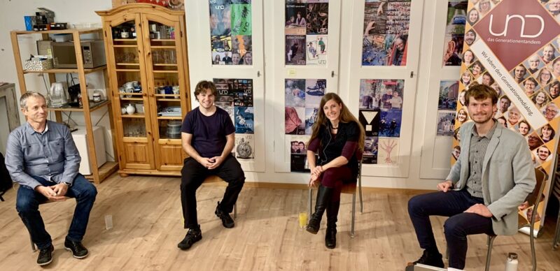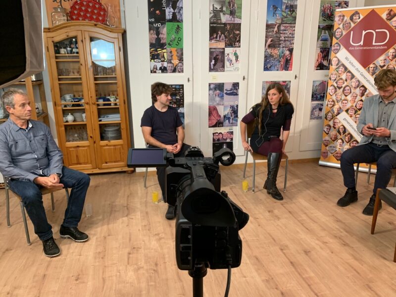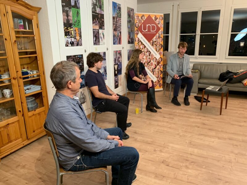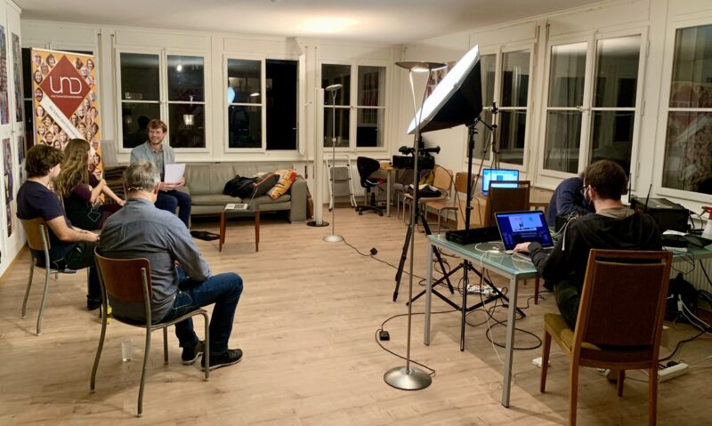 Das Podiumsgespräch findet im UND-Raum statt und wird auf verschiedenen Kanälen live übertragen. Die ZuschauerInnen können laufend Fragen stellen. Der Raum hat sich in ein kleines «Fernsehstudio» verwandelt – mit Kameramann, Tontechniker und Techniksupport. Eine besondere Herausforderung für alle Beteiligten, weil der Anlass doch ursprünglich als öffentliches Event geplant war und nun das Publikum fehlt. Überraschend lebendig und vielfarbig, engagiert und pointiert entwickelt sich das Gespräch.