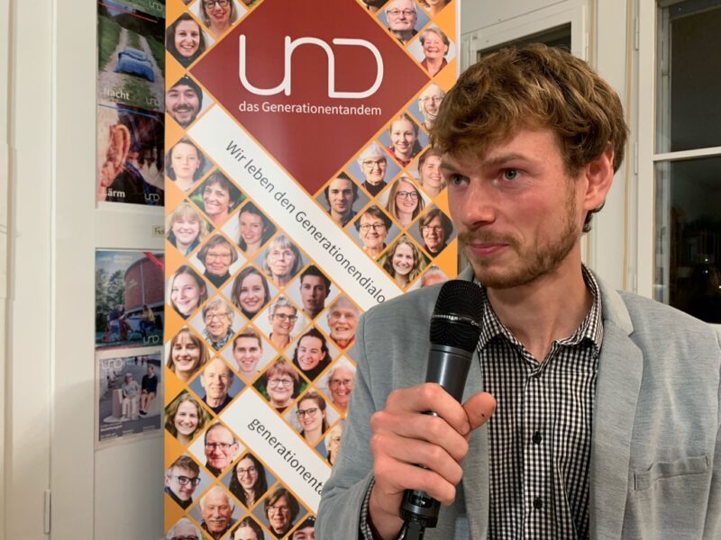 Grundlage der Diskussion sind Gedanken von Menschen aller Generationen in Videoform. Marco Kauer (27) moderiert das Podium (ganz oben im Beitrag).
