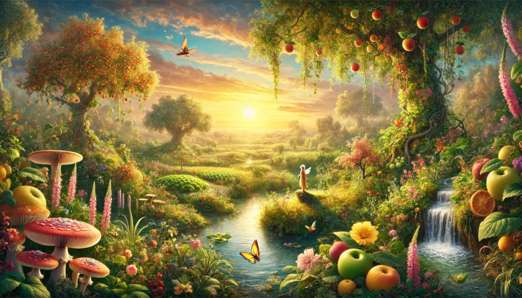 Eines Nachts träumte er einen Traum vom Paradies. Er wurde in eine paradiesische Traumwelt entführt, wo er nicht mehr aus dem Staunen herauskam. Die Bäume waren behangen mit vielen reifen Früchten. Die Felder waren übersät mit tausenderlei verschiedenen Blumen und Pflanzen. Die Vöglein zwitscherten freudig der aufgehenden Sonne entgegen. Es war eine Harmonie, und er fühlte sich verbunden mit den Gewässern, die dahinplätscherten, mit dem ruhigen Seelein, mit den Enten, ja, er war Eins mit der ganzen prächtigen Natur.