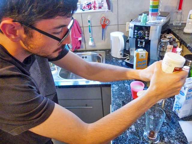 So blieb diese Blinddegustation relativ ausgeglichen, wie die Meinungen zum Geschmack ja so oft auseinandergehen. Später bat ich meine Gäste zu Tisch, der bereits mit Muffins und verschiedenen Kuchen gedeckt auf sie wartete. Währenddessen stellte ich die 3 Variationen von kaltem Kaffee nochmals kurz vor und nahm, fast schon wie ein Barista, die Bestellungen auf. «Ä chaute Mokka» hörte ich zweimal und auch der Cold Brew wurde mehrfach gewünscht. So machte ich mich also daran, diese Getränke zuzubereiten.