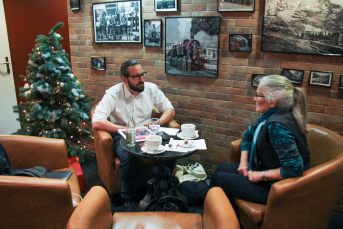 Ins Gespräch vertieft: Manuel Fabry und Erika Kestenholz. – Bild: Elias Rüegsegger
