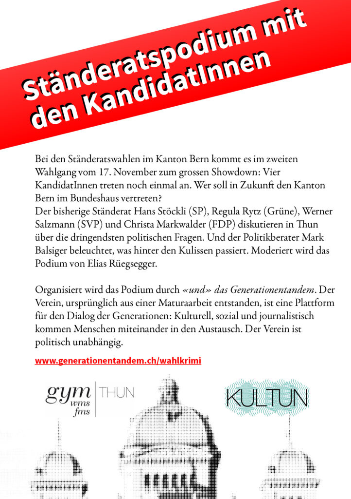 Am Montag, 11. November um 19.30 Uhr, diskutieren sämtliche Kandidierenden und der Politikberater Generationentandem lädt im Gymnasium Thun am Standort Schadau Jung und Alt zur öffentlichen Wahldebatte. Auch das Publikum kann sich an der Diskussion via E-Mail oder SMS/WhattsApp beteiligen. Das Ständeratspodium wird via Facebook-Livestream übertragen. Moderiert wird der Anlass von UND-Initiant Elias Rüegsegger. Im Anschluss an das Podium bietet der Verein den BesucherInnen bei einem Apéro die Gelegenheit, die Diskussionen zu vertiefen und ein Wort mit den Kandidierenden zu wechseln.