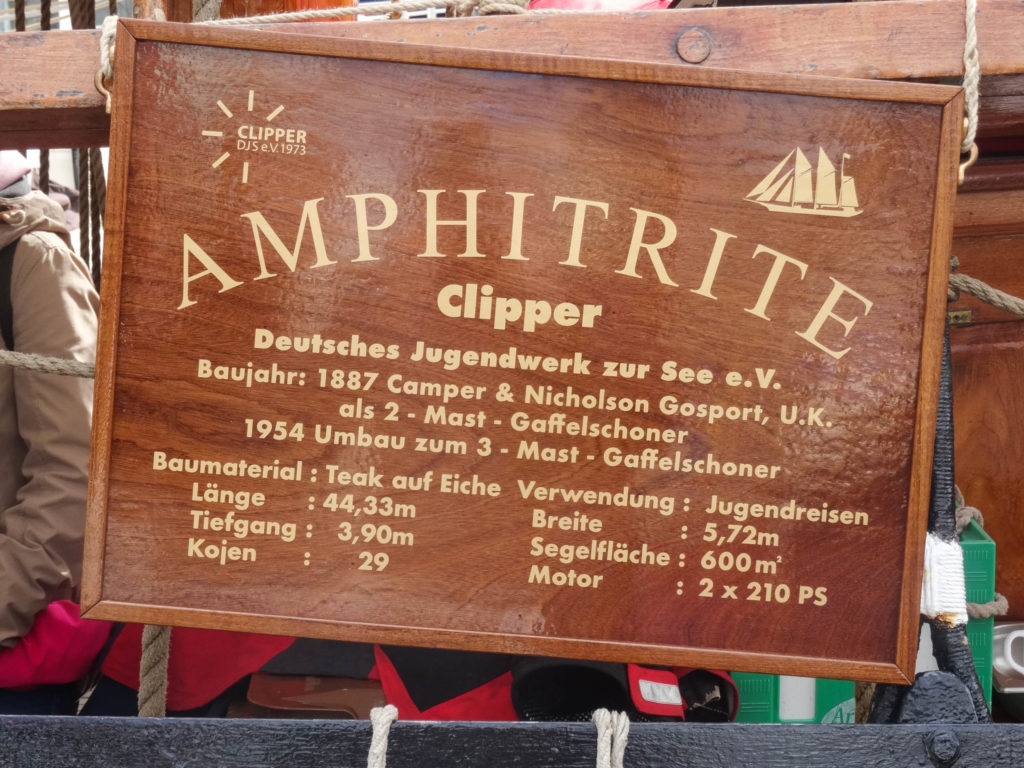 Wurde zwischen 1884 und 1887 in Grossbritannien als Dreimaster in Holz gebaut. Das 44 Meter lange Schiff wird als die älteste seegehende Segeljacht der Welt bezeichnet. Nach einer langen Geschichte segelt das Boot unter der Flagge des Vereins Clipper – Deutsches Jugendwerk zur See (5‘000 Mitglieder, vier Schiffe). Sinn und Zweck ist es, vor allem Jugendlichen, aber auch allen anderen Interessierten die traditionelle Seefahrt näherzubringen. Das Fahrtgebiet ist die Ostsee im Bereich der deutschen, dänischen, schwedischen und polnischen Küstengewässer. Heimathafen ist Bremen. Die Segelfläche wurde reduziert. Ausserdem wurden eine grosse Zahl zusätzlicher Kojen eingebaut, dazu Toiletten und eine Kombüse (Küche). Dieses Schiff kann auch zukünftigen Generationen als Vorbild dienen. Die Amphitrite hat viele Ups and Downs zu verzeichnen und vielen Stürmen getrotzt!
