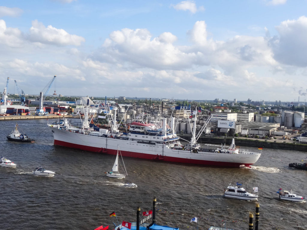 Dieses Bild wurde von der Terrasse der neuen Elbphilharmonie aus aufgenommen. Dieses Schiff ist das grösste fahrtüchtige Frachtschiff der Welt. Es ist das letzte noch erhaltene Schiff einer Serie von sechs schnellen Stückgutfrachtern, die 1961/62 für die Reederei Hamburg Süd gebaut wurden und bis Ende 1981 vorzugsweise nach Südamerika gefahren sind. Seit 1988 ist die Cap San Diego ein Museumsschiff, seit 2003 zudem maritimes Denkmal und schwimmendes Hotel, das heute seinen Liegeplatz an der Überseebrücke in Hamburg hat. Besatzung: 35 Mann. Das Schiff läuft noch heute jährlich zu mehreren Fahrten mit Passagieren aus. Unterhalten wird es von alten und jungen «Seebären» in Fronarbeit, also im wahrsten Sinne des Wortes generationenübergreifend.