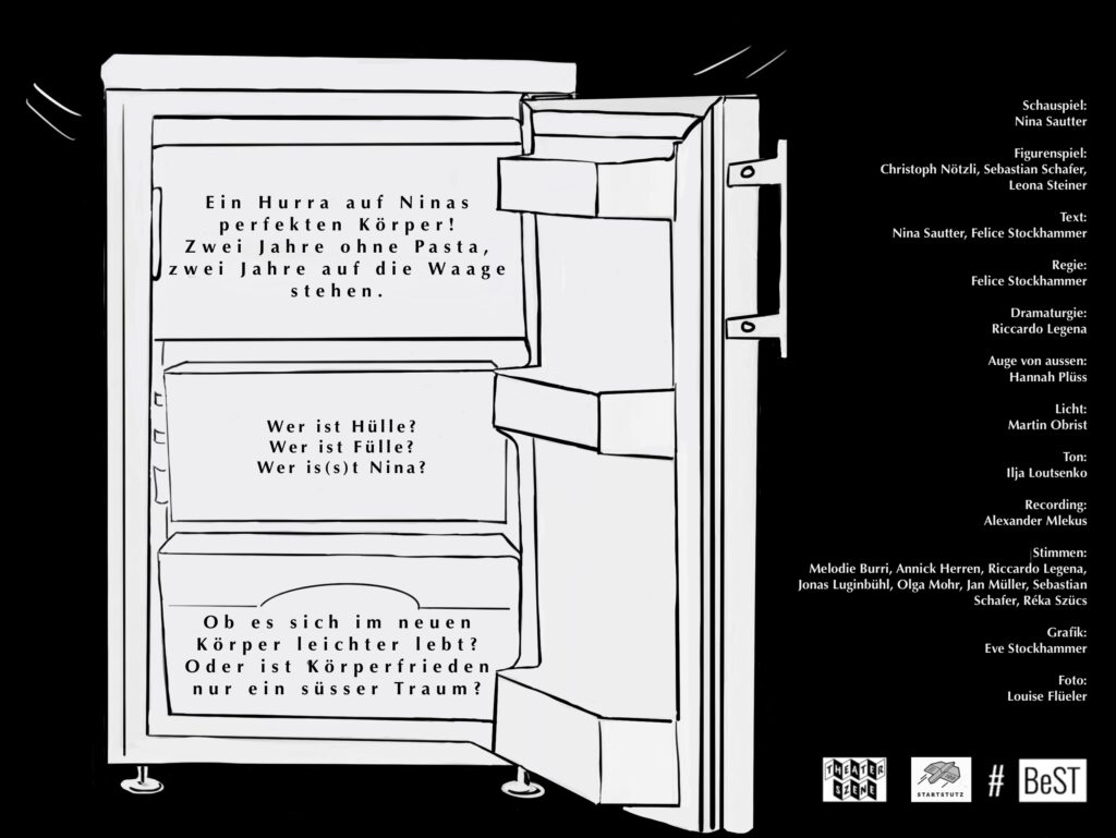 Auf der Bühne steht ein schwarzer Psychiater-Fauteuil, darauf thronend ein übergrosses Diätbuch. In düsterer Schatten-Atmosphäre wandeln drei anonyme Figurenspieler in schwarzen enganliegenden Körperanzügen. Kühlschänke auf Rädern drehen zu Videosequenzen steile Runden. Oben auf sitzt Nina Samsa im Nacht-Negligé, die diätversessene Protagonistin und einzige Menschdarstellerin auf der Bühne, berauschend gespielt von Schauspielerin Nina Sautter.