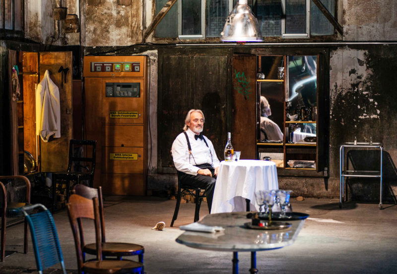 Das Bühnenbild (Leo de Nijs) ist das Zuhause des Kellners, welches sowohl seine Wohnung als auch das Restaurant darstellt. Der alte Mann ringt mit seiner Einsamkeit. Er ist enttäuscht vom Lebensabend nach einem Leben im Dienst anderer, denen er die Wünsche von den Augen ablesen musste, aber seine Sehnsüchte nie erfüllen konnte. Er träumt sich in die Vergangenheit, «wo er als Kellner wie ein Balletttänzer zwischen den Korbstühlen schwebte. Mit Blasen an den Füssen.»