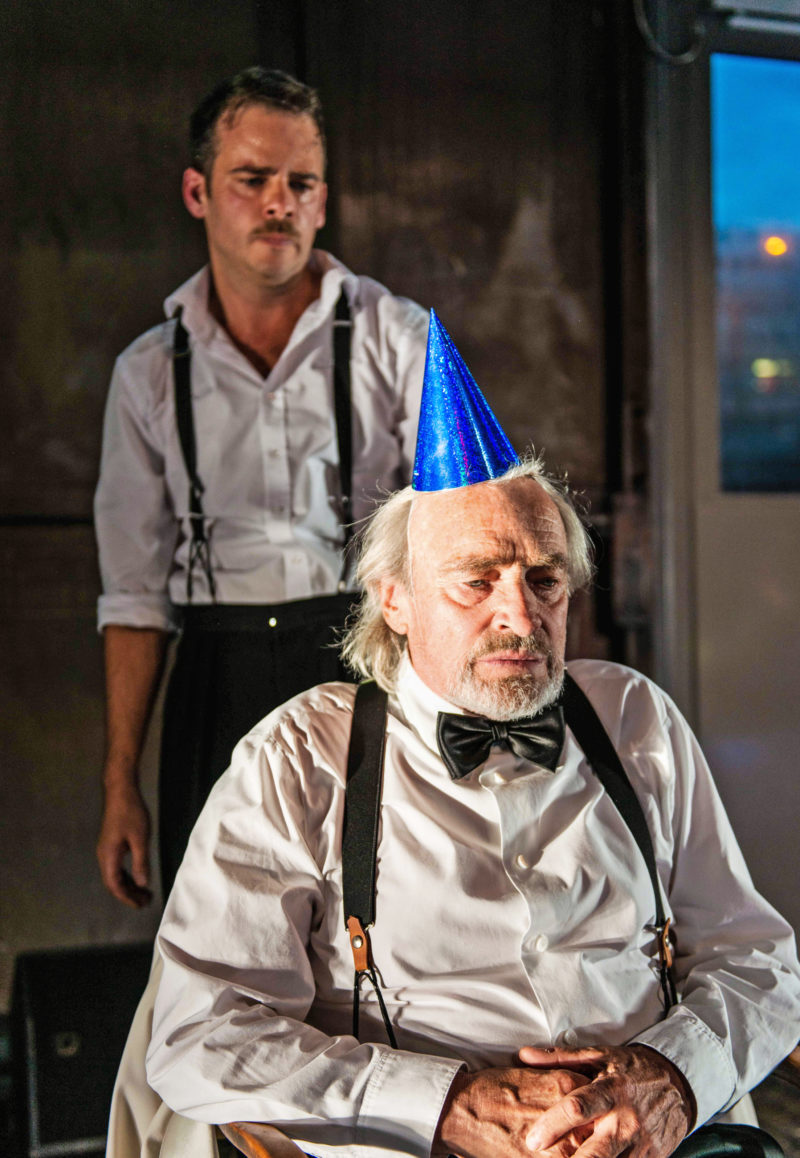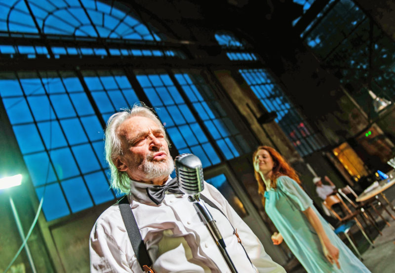 Wunderbar der Anfang mit dem Betreten des Spielortes direkt von draussen in das Foyer. Über die Bühne gehend, sucht man sich einen Platz aus auf einem der verschiedenen Stühle. Das riesige Schiebetor wird von zwei «Alten», Gäste des Kellners, mit Ach und Krach geschlossen.