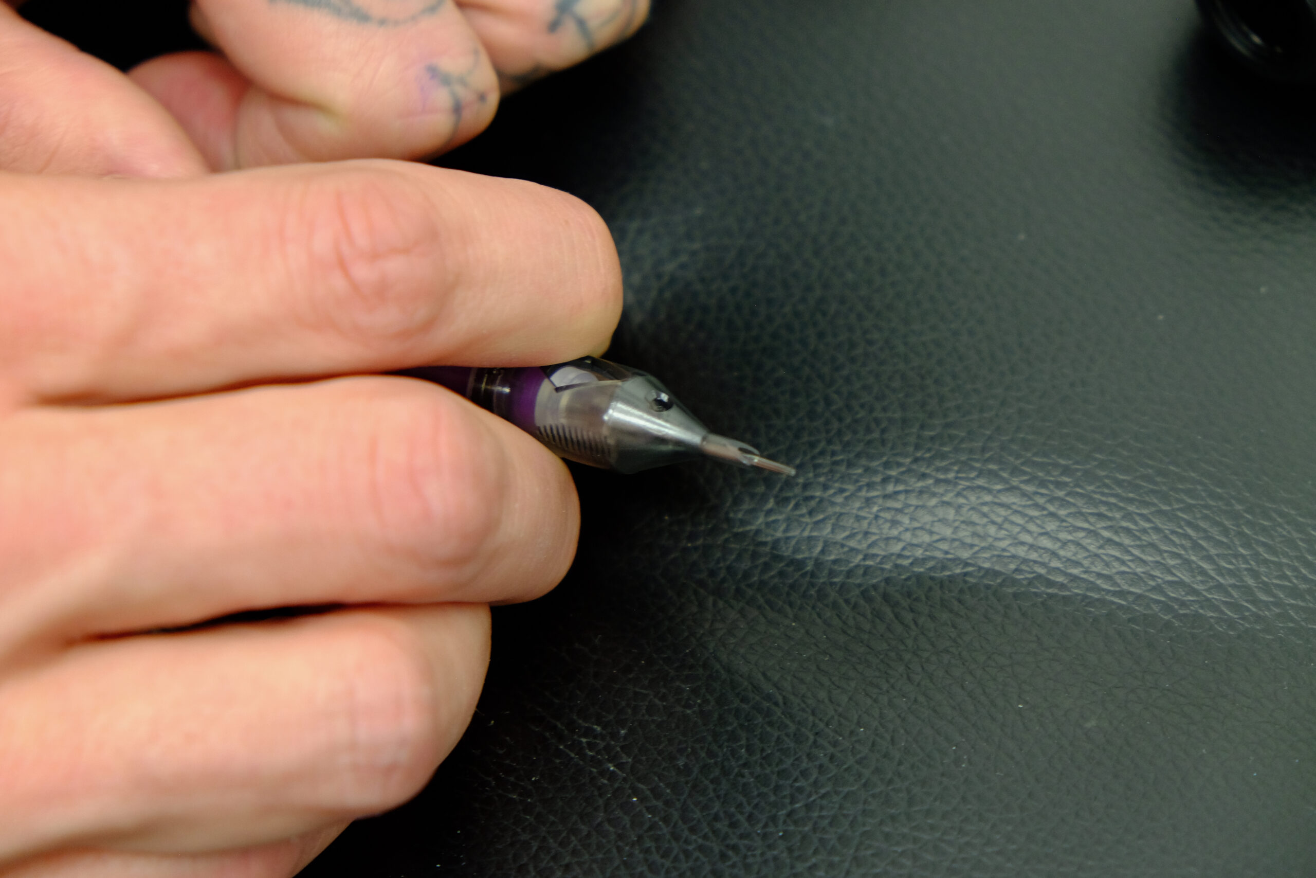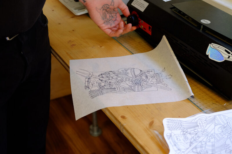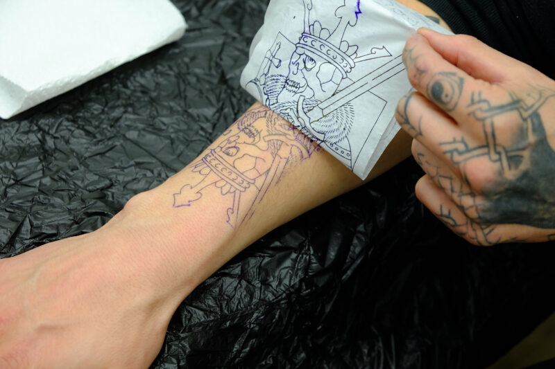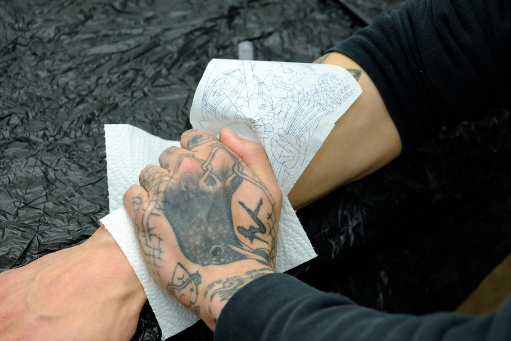 Die Liege ist gereinigt, desinfiziert, mit einer Schutzfolie überzogen – alles nach berufsspezifischer Hygiene. Sujet können feine Linien, zarte Schriftzüge oder ein ganz persönliches Thema mit einer vorgedruckten Schablone sein. Eine grosse Vielfalt und Kreativität umfasst dieses Handwerk. Ist so weit alles bereit, wird das Motiv final nochmals besprochen. Änderungen können noch vorgenommen werden. Ist das Sujet in Ordnung, wird die gewünschte Körperstelle vorbereitet. Je nachdem muss die Stelle rasiert und in jedem Fall desinfiziert werden. Beim persönlichen Sujet wird die angefertigte Matrize fest auf die Haut gedrückt. Bis zur perfekten Platzierung kann es mehrere Anläufe benötigen, das ist nicht ungewöhnlich. Dann wird das Papier vorsichtig abgezogen.