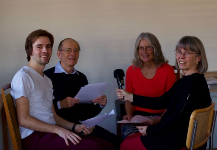 Blick hinter die Kulissen: Elias Rüegsegger, Jürg Krebs, Erika Kestenholz sprechen ihre Rollen – Annemarie Voss nimmt auf. – Bild: Verena von Känel